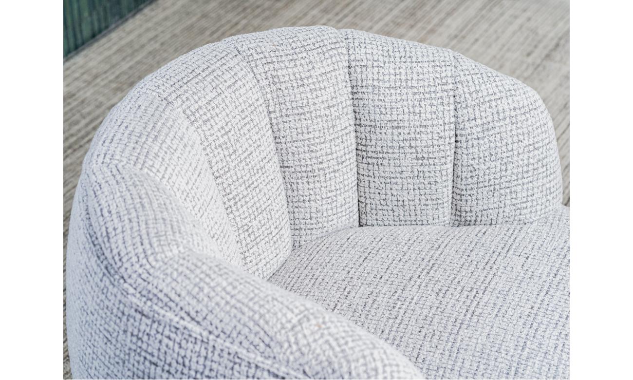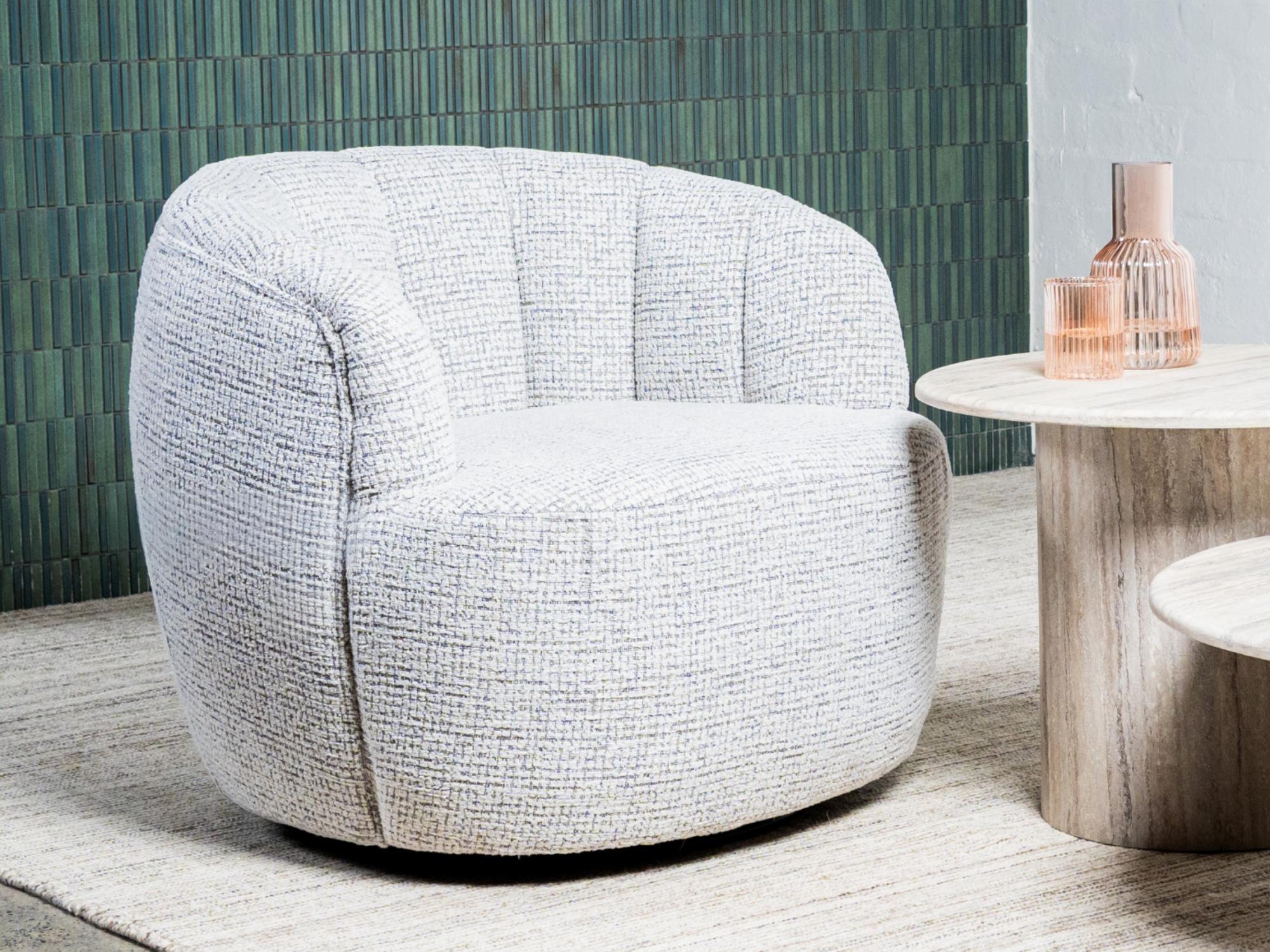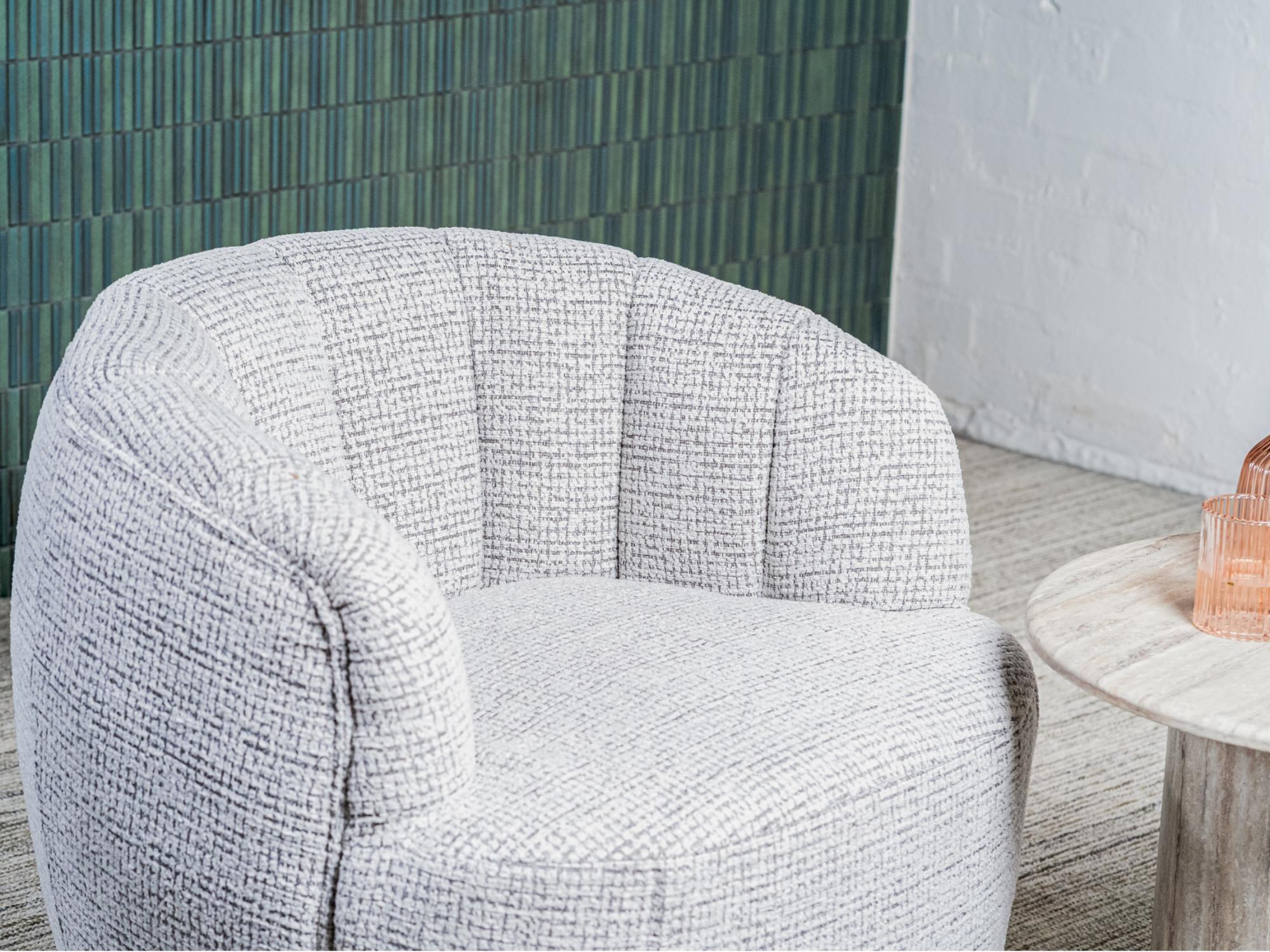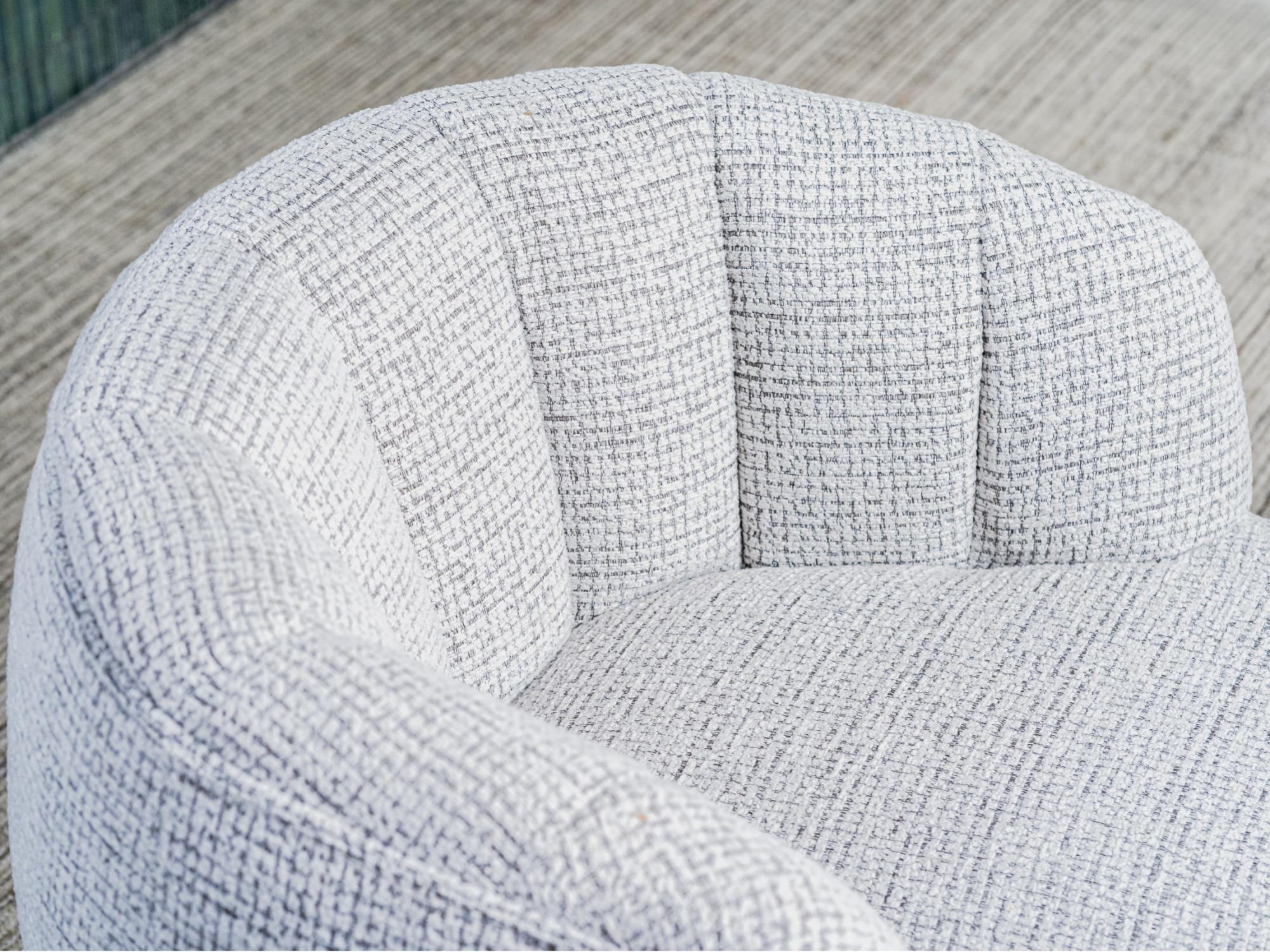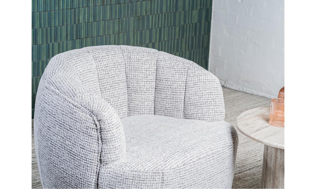 Sink into modern comfort with this elegantly curved Arlington armchair, upholstered in a soft textured fabric that adds depth and character to any space. Resting on a sleek black powder-coated metal base, it offers a smooth 360° swivel for effortless movement and versatility. A perfect balance of style and functionality, this chair is designed to elevate both contemporary and classic interiors.
