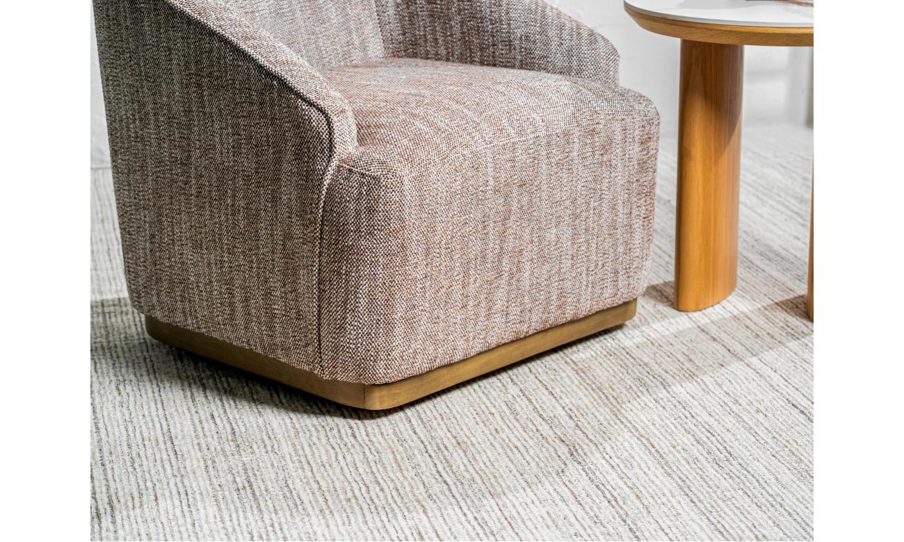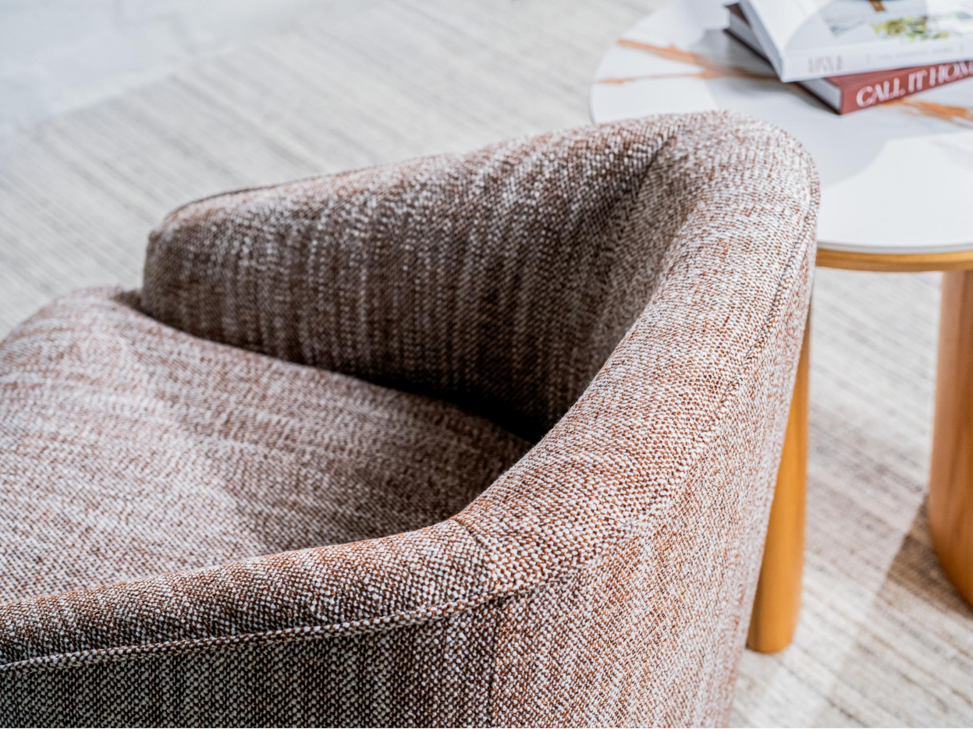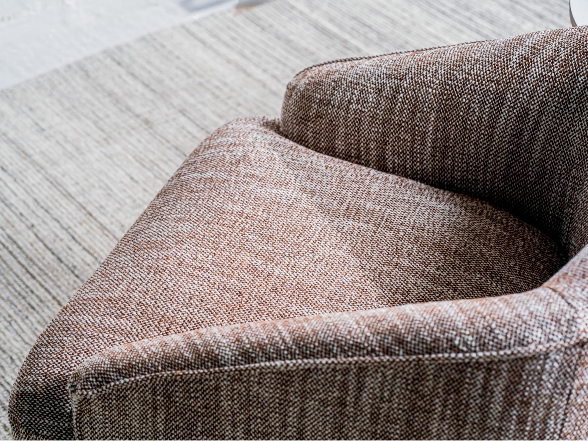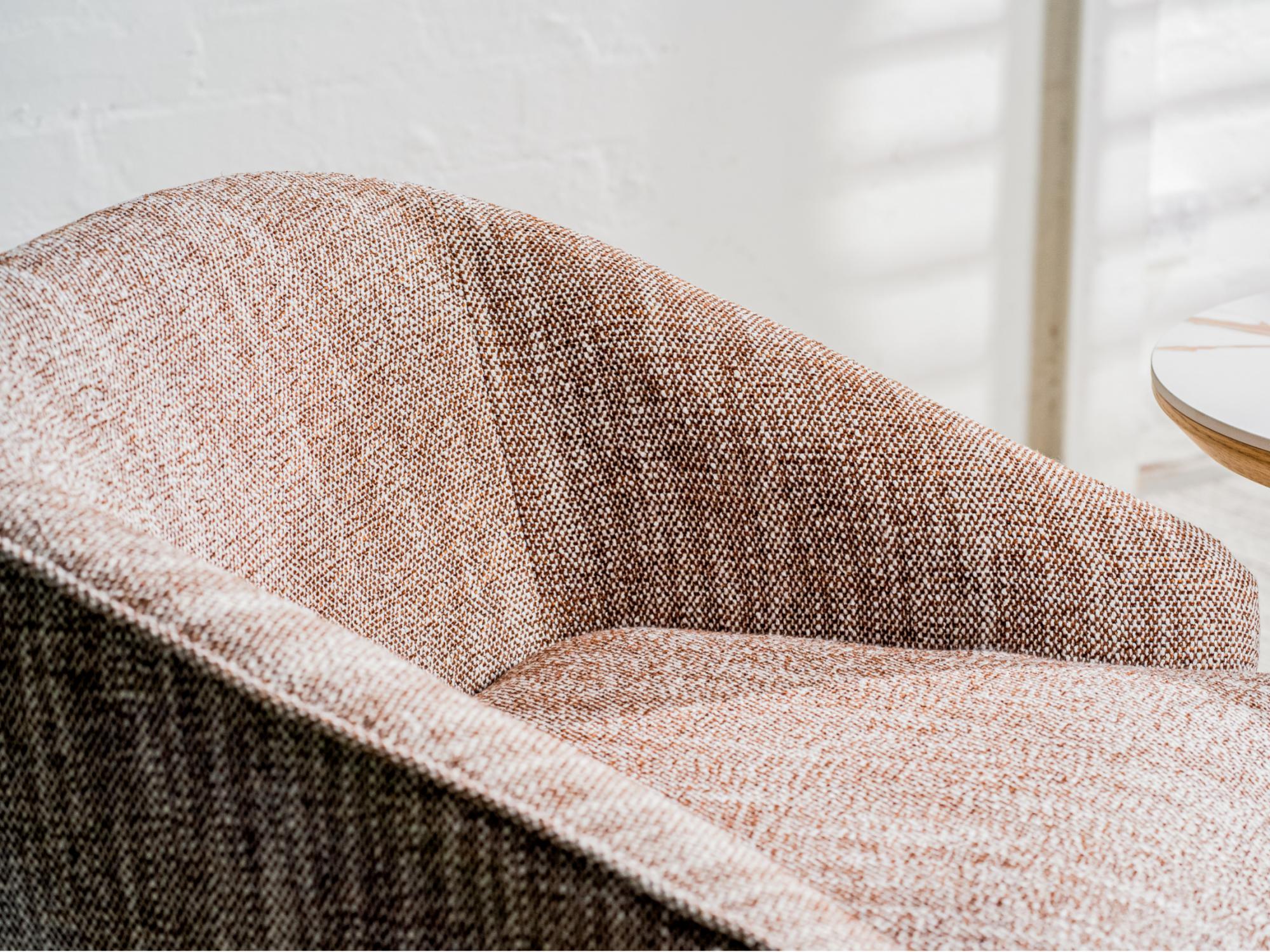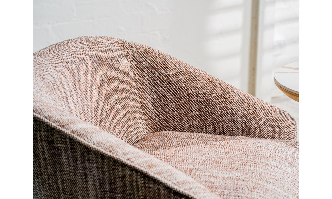 Wrapped in a rich textured fabric, this Austin armchair combines effortless style with everyday comfort. Its stainless steel base in a warm bronze finish adds a refined touch, while the smooth 360° swivel ensures both elegance and practicality in any room.