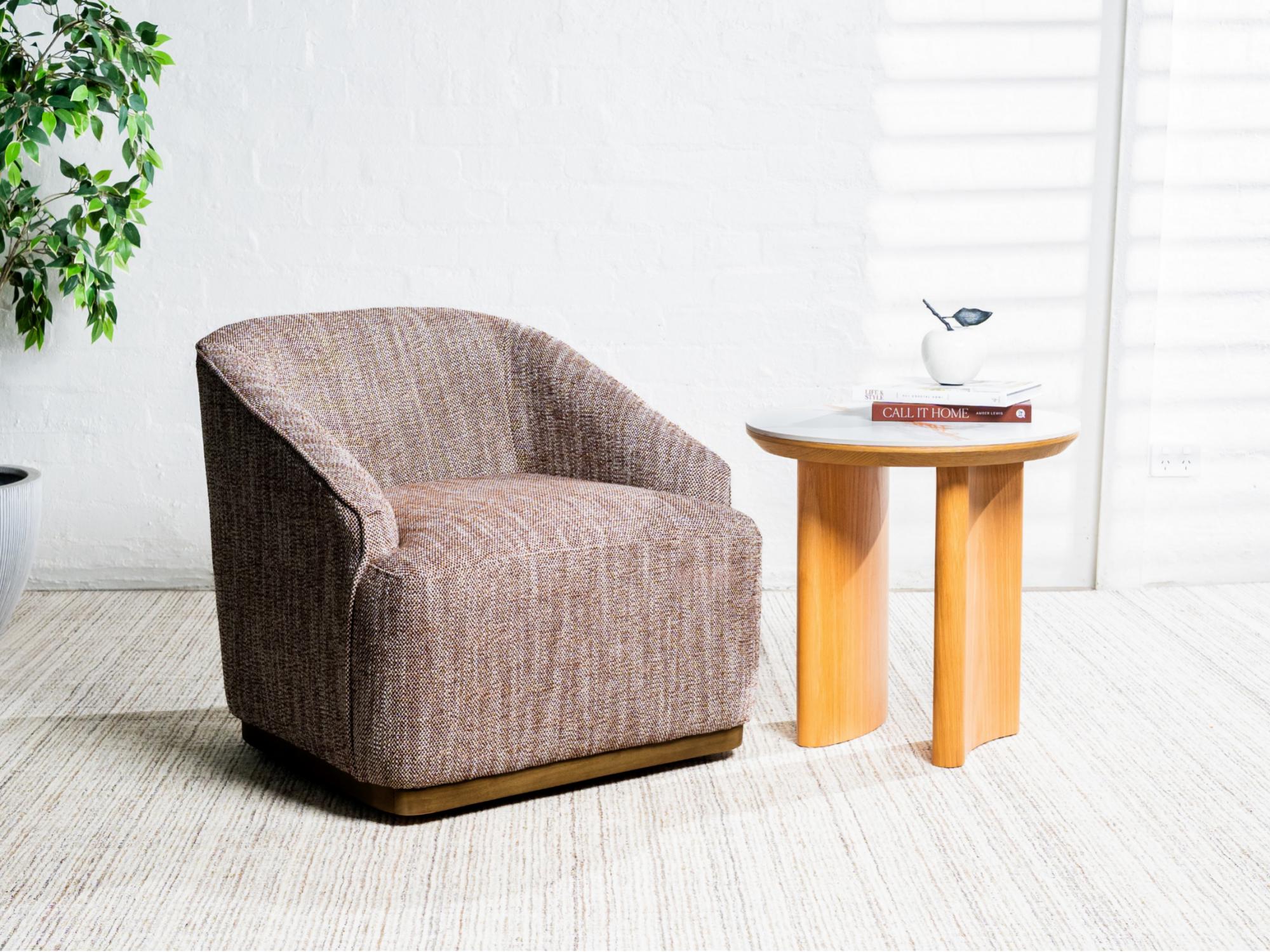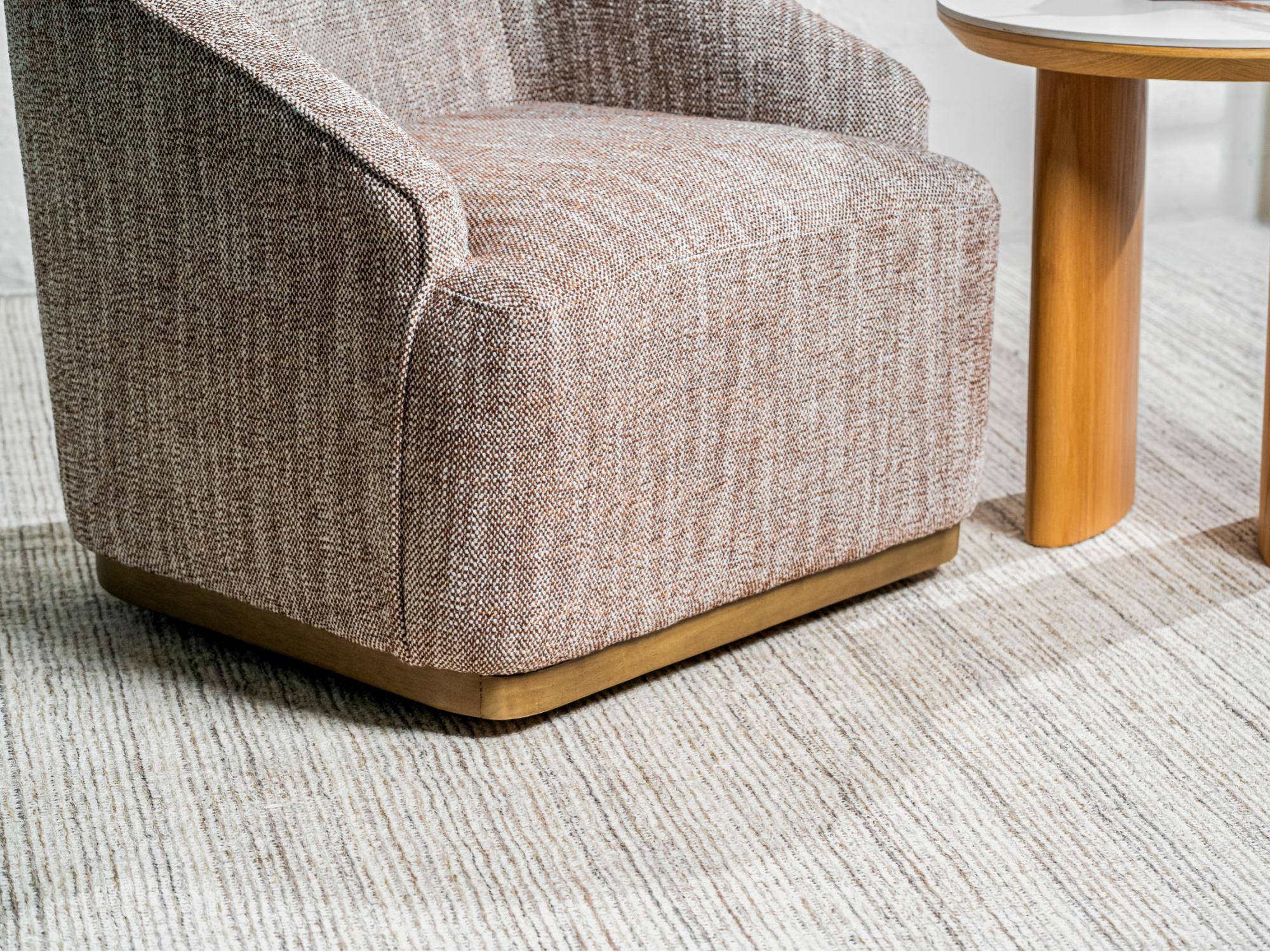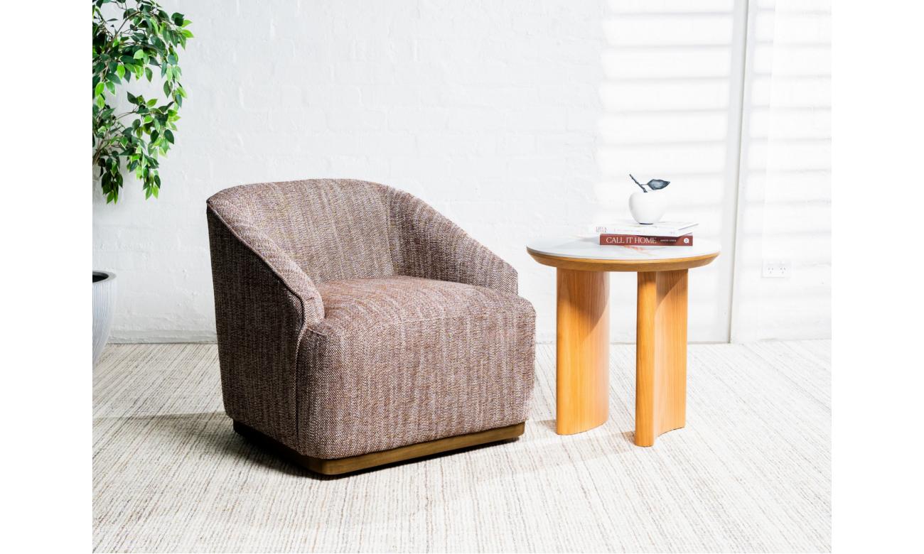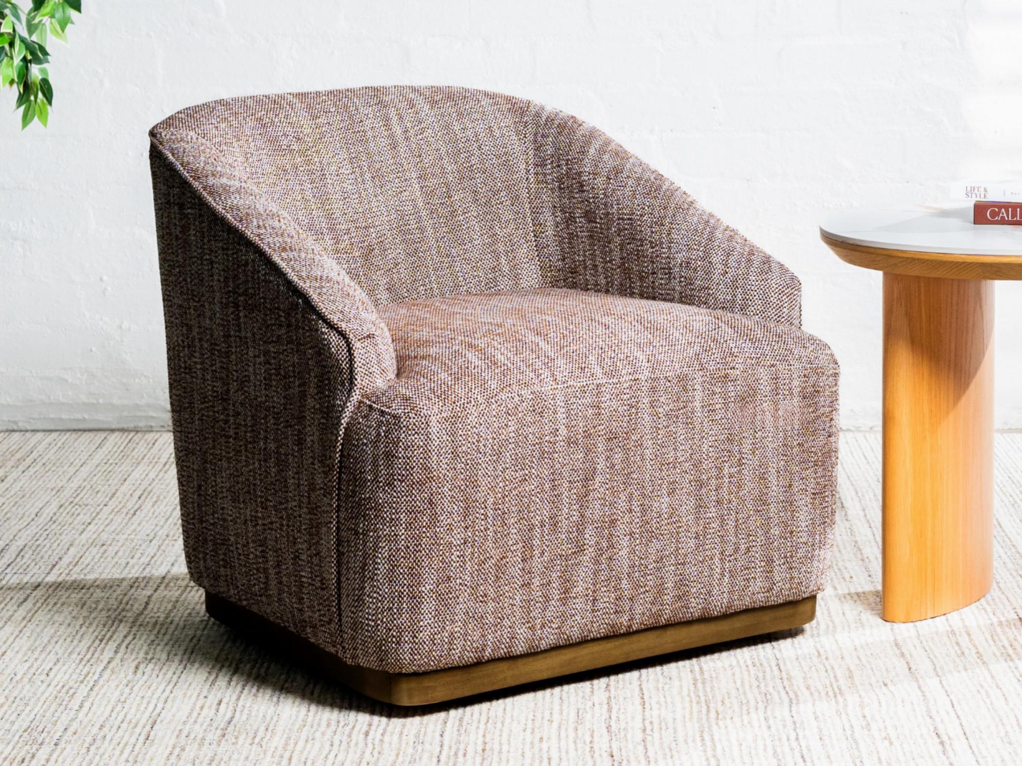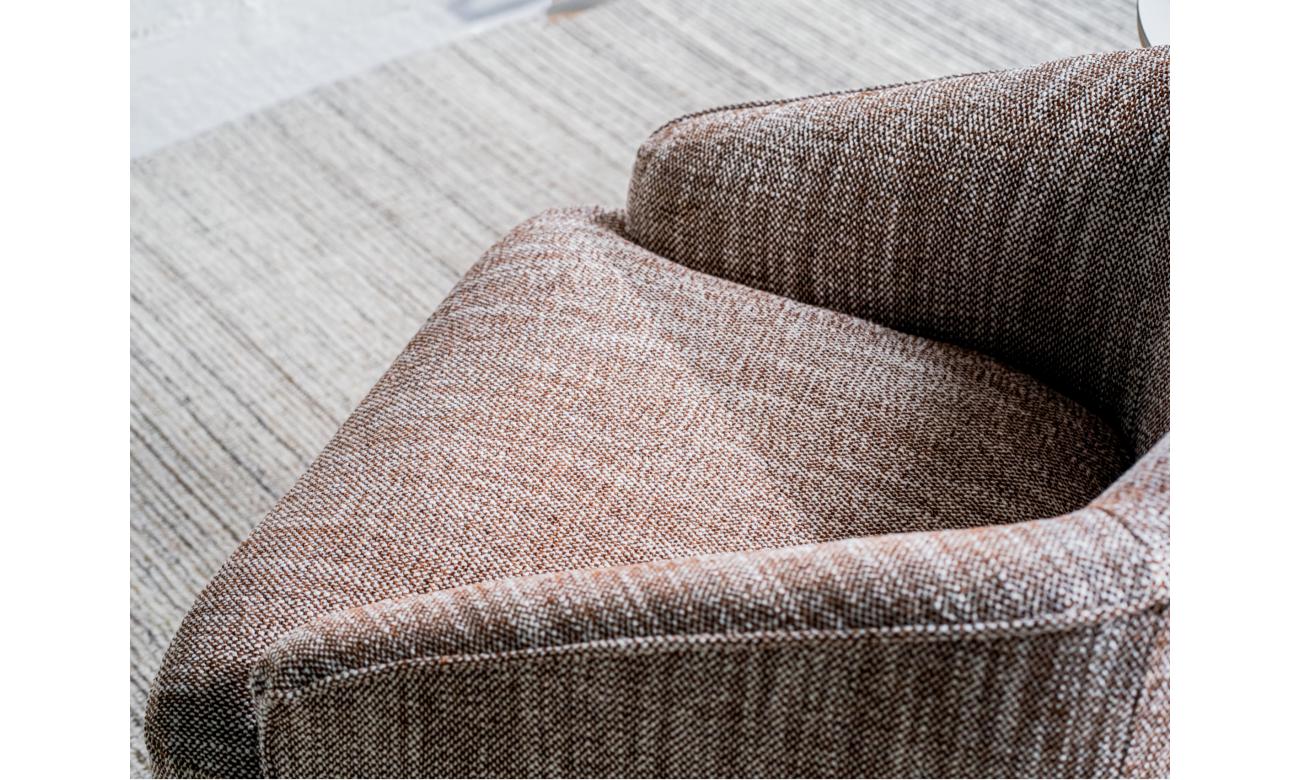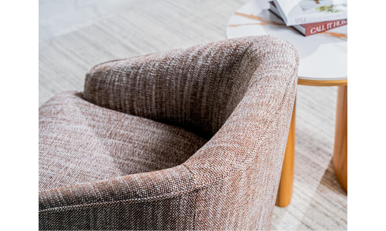 Wrapped in a rich textured fabric, this Austin armchair combines effortless style with everyday comfort. Its stainless steel base in a warm bronze finish adds a refined touch, while the smooth 360° swivel ensures both elegance and practicality in any room.