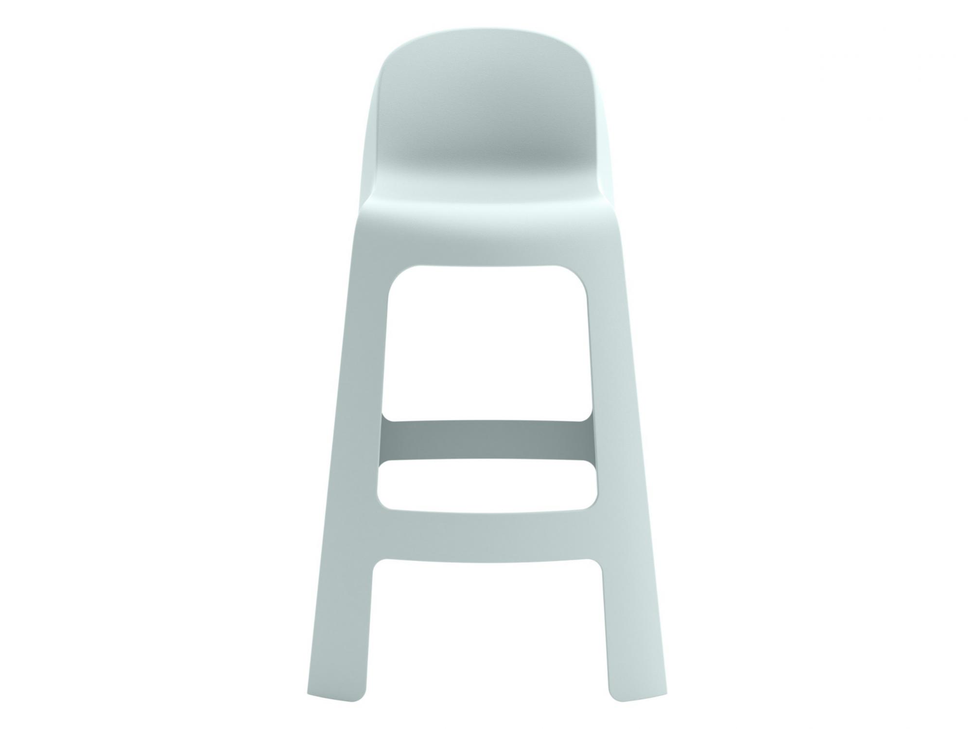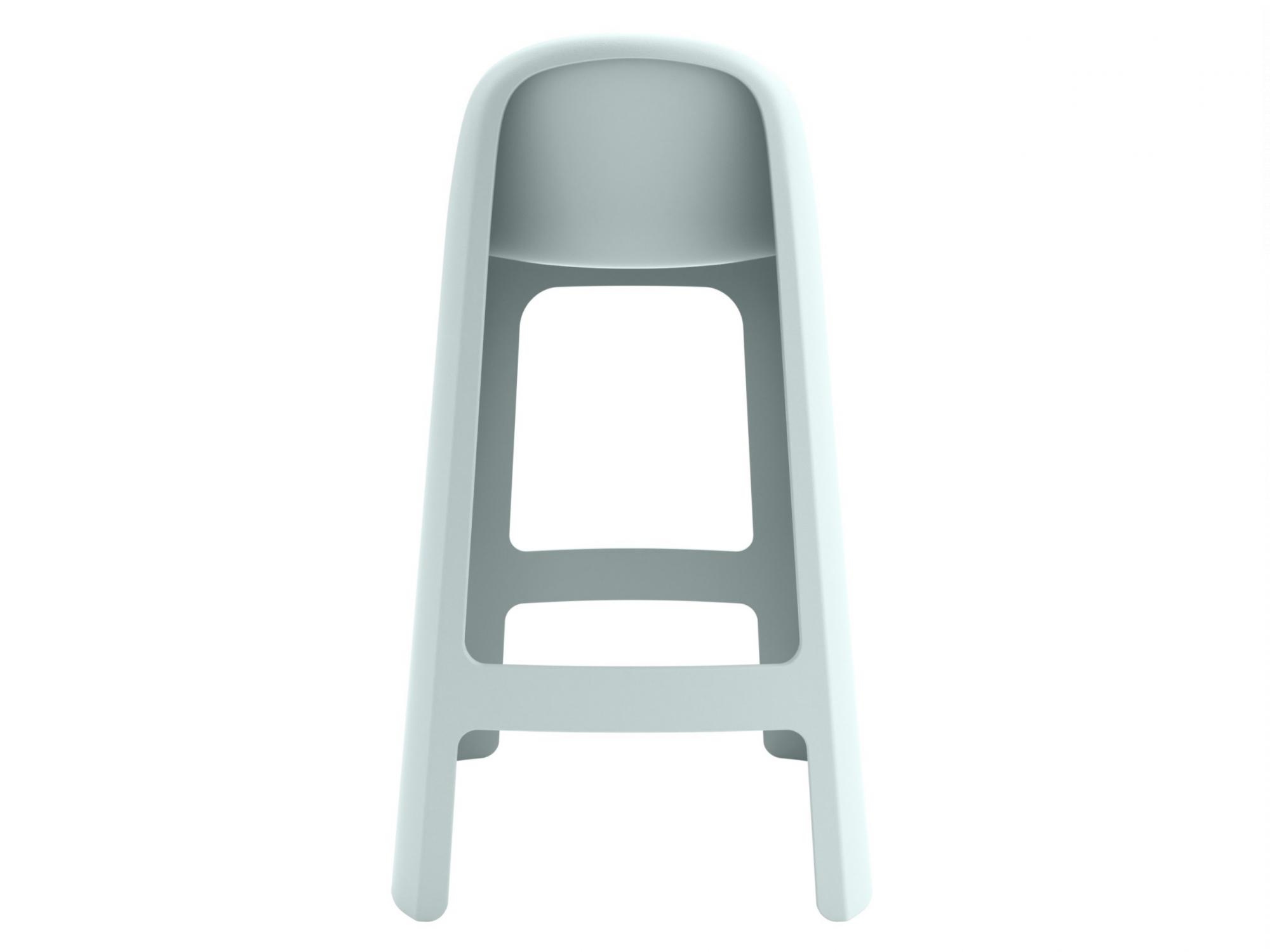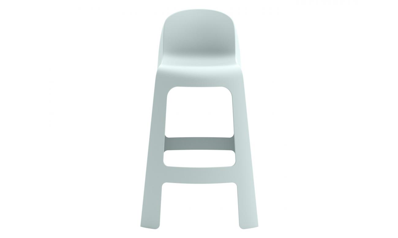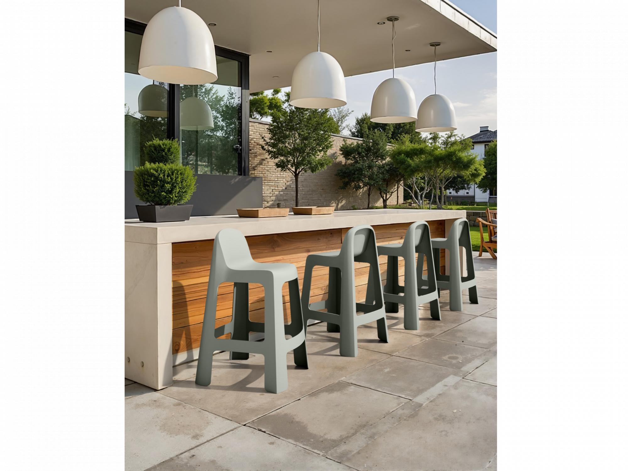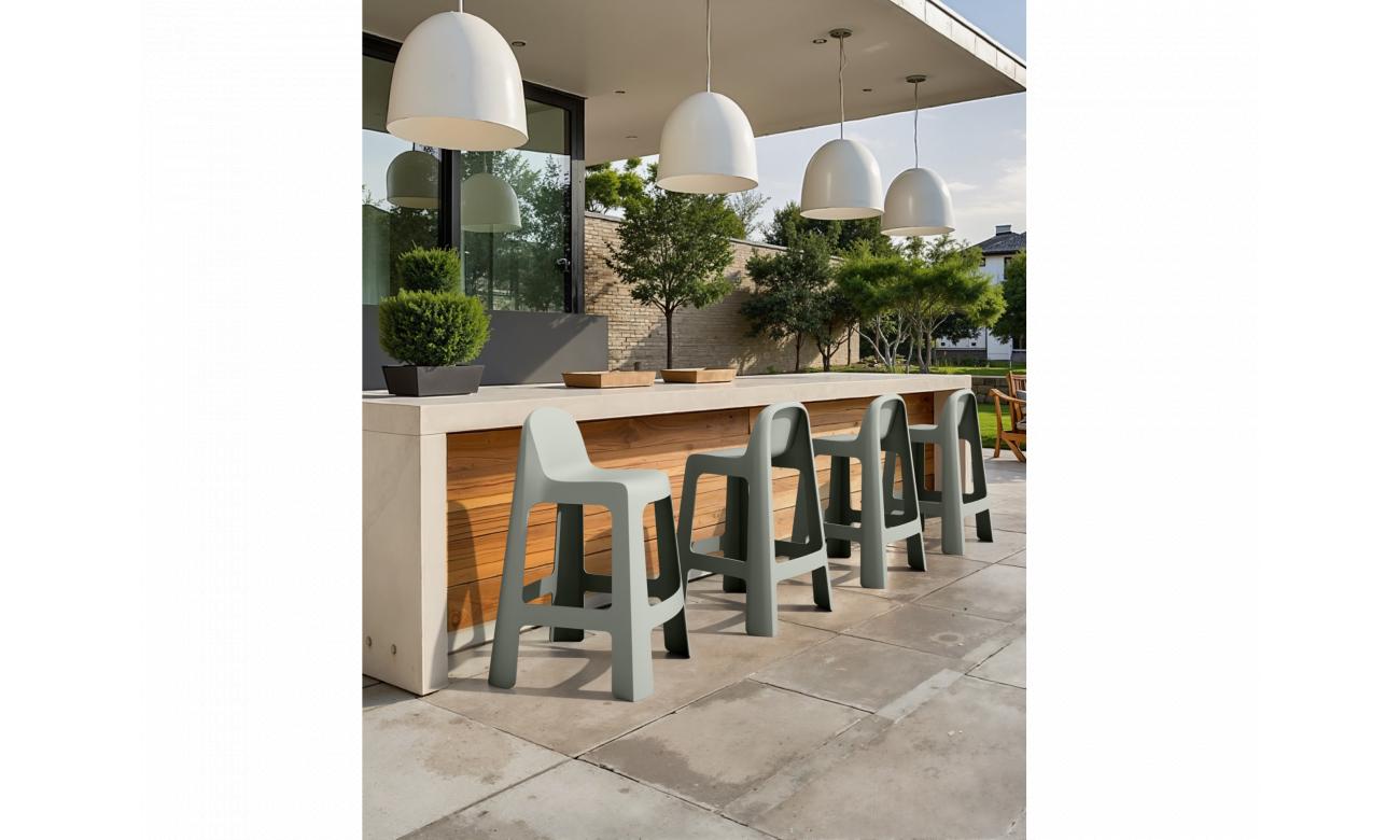 A minimalist outdoor bar stool designed for comfort and durability. The curved seat and lightweight all-plastic build make it both practical and stylish for outdoor bar settings.