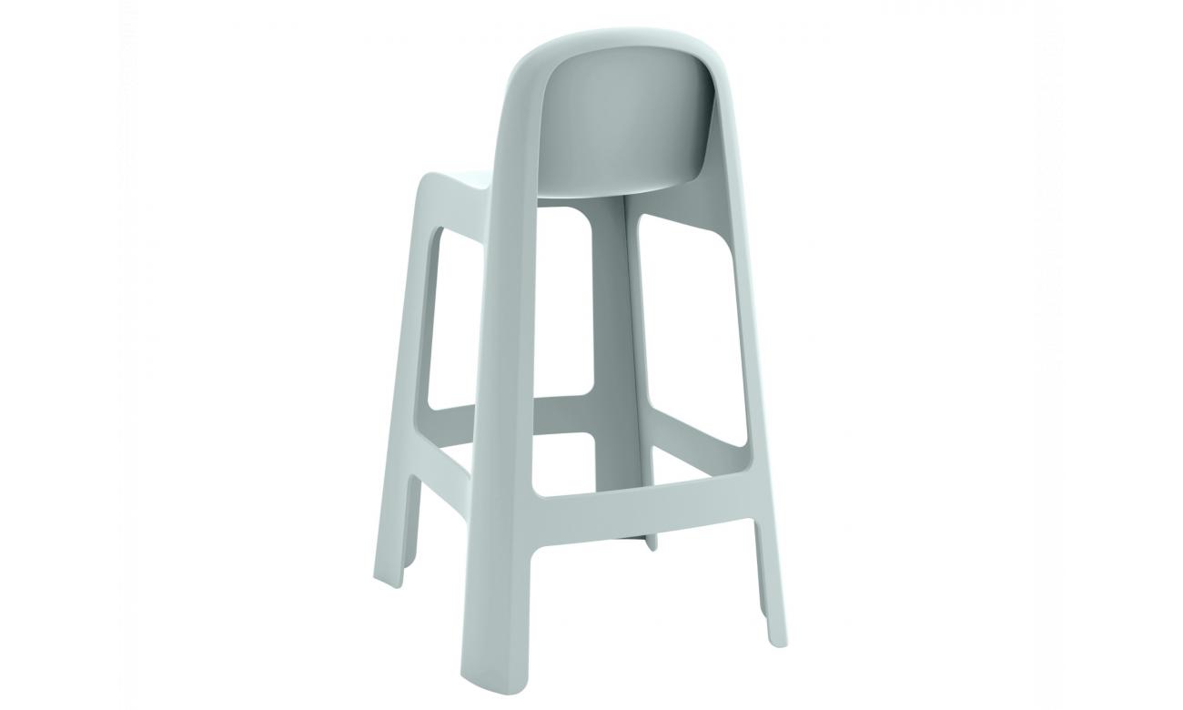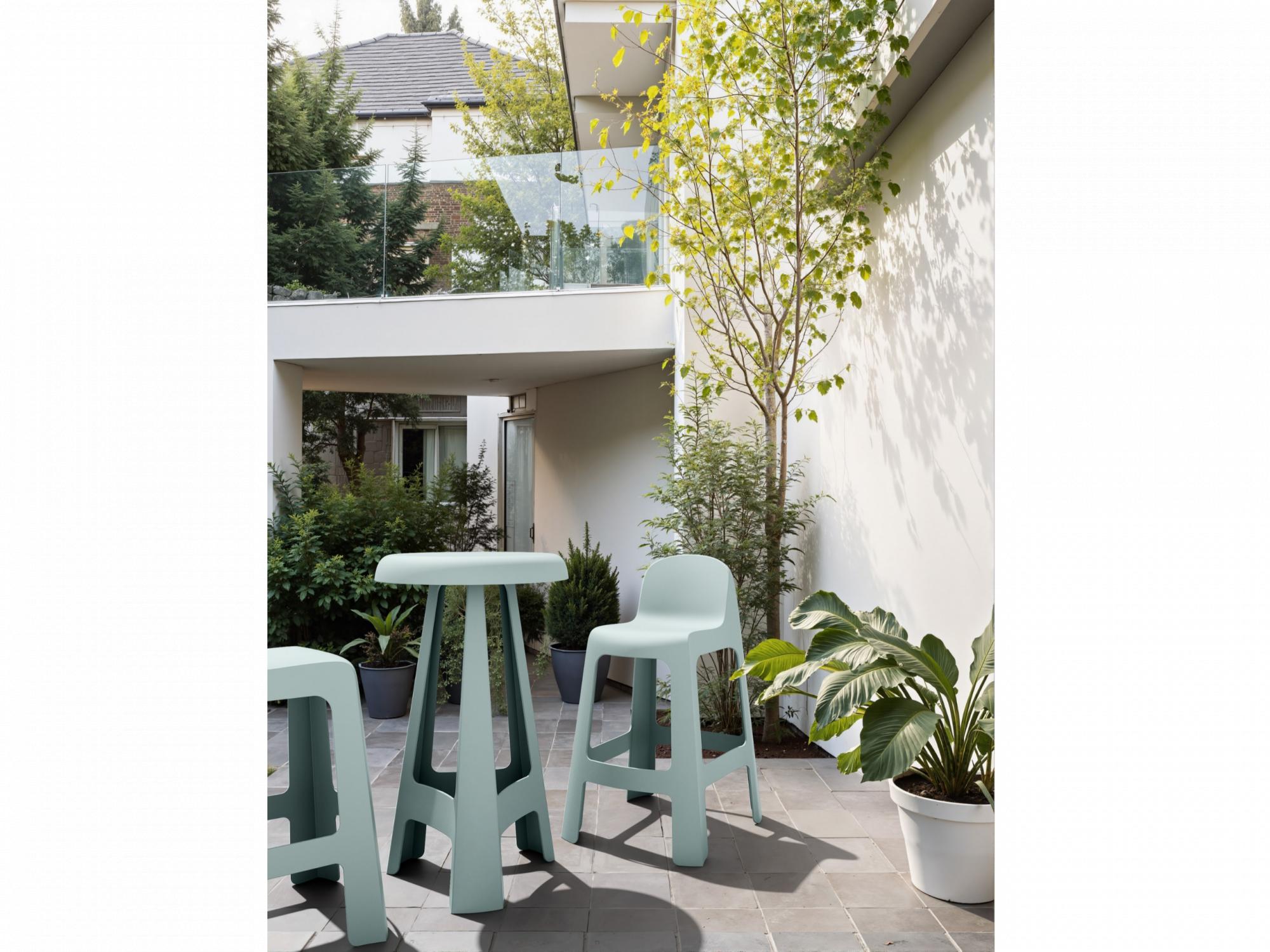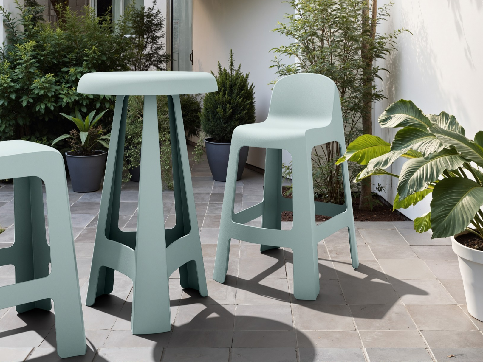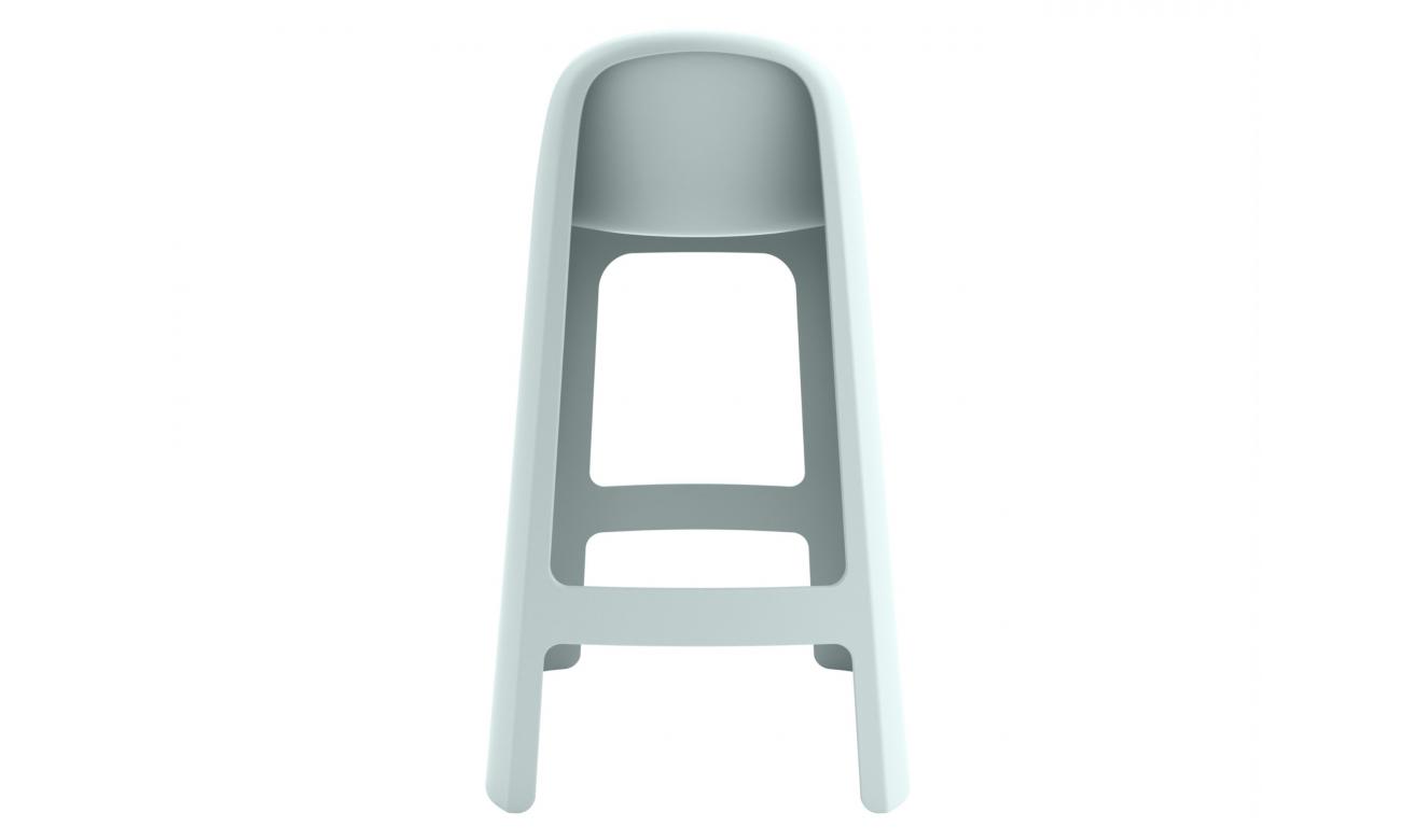 A minimalist outdoor bar stool designed for comfort and durability. The curved seat and lightweight all-plastic build make it both practical and stylish for outdoor bar settings.