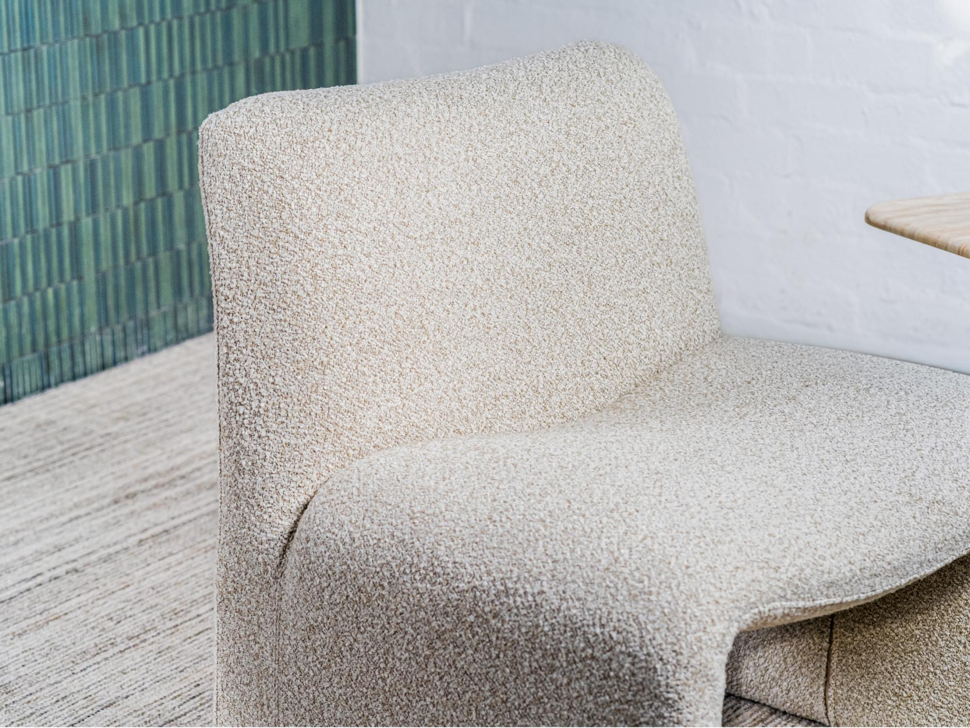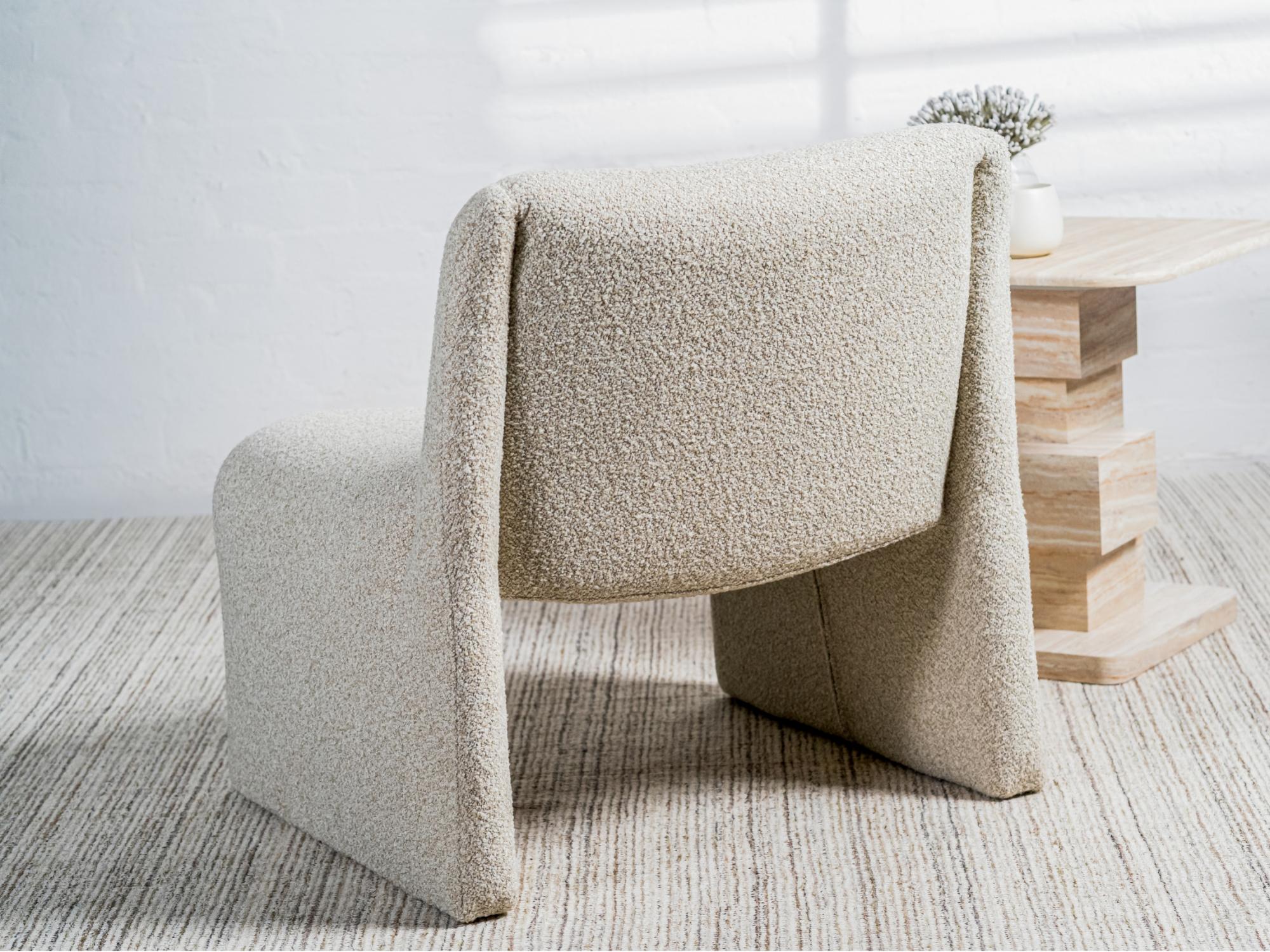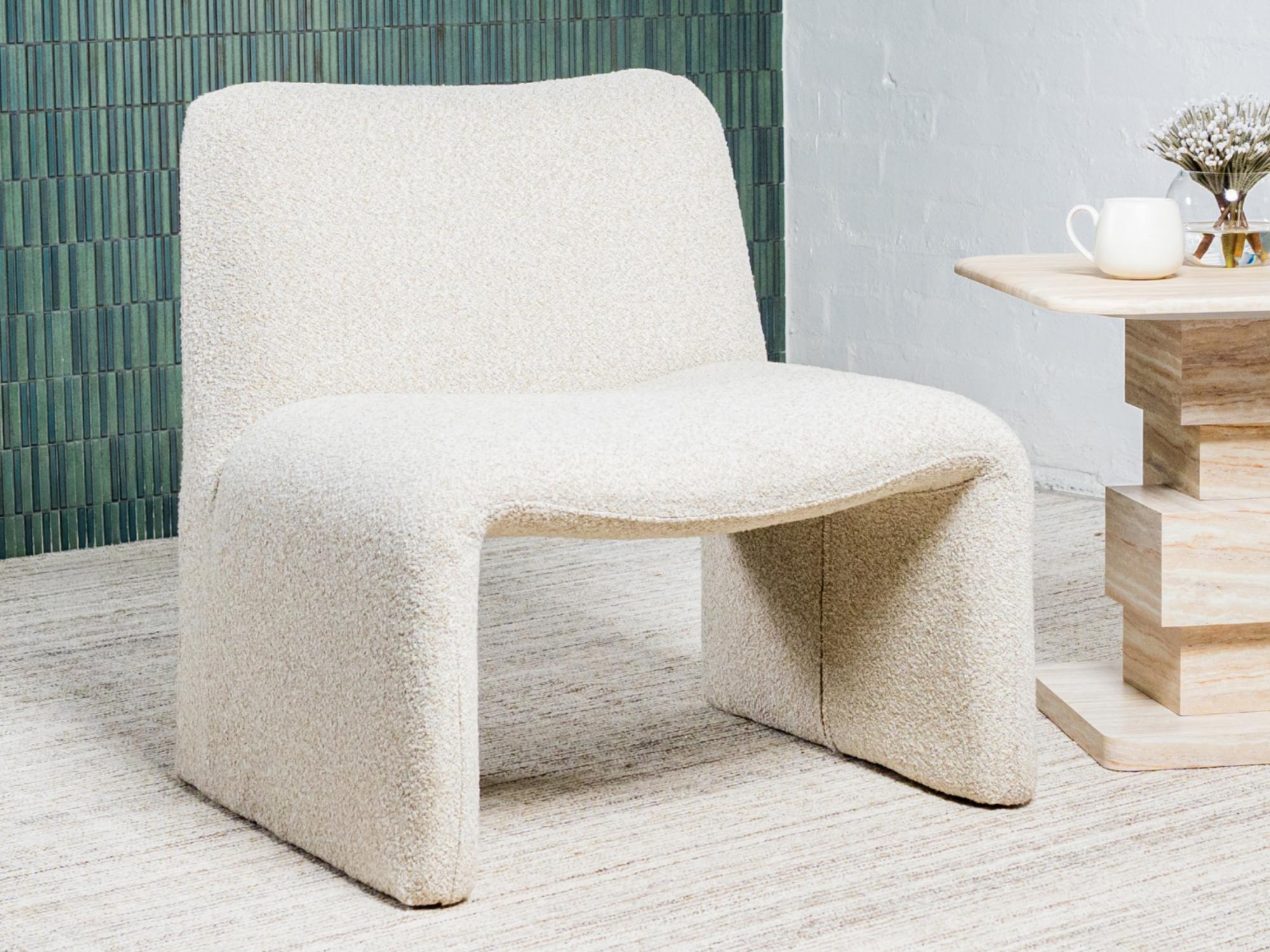 The Calais chair makes a striking statement with its sculptural silhouette and inviting curves. Now introduced in a soft beige boucle fabric, it offers both warmth and texture, bringing a fresh, contemporary touch to this iconic design.