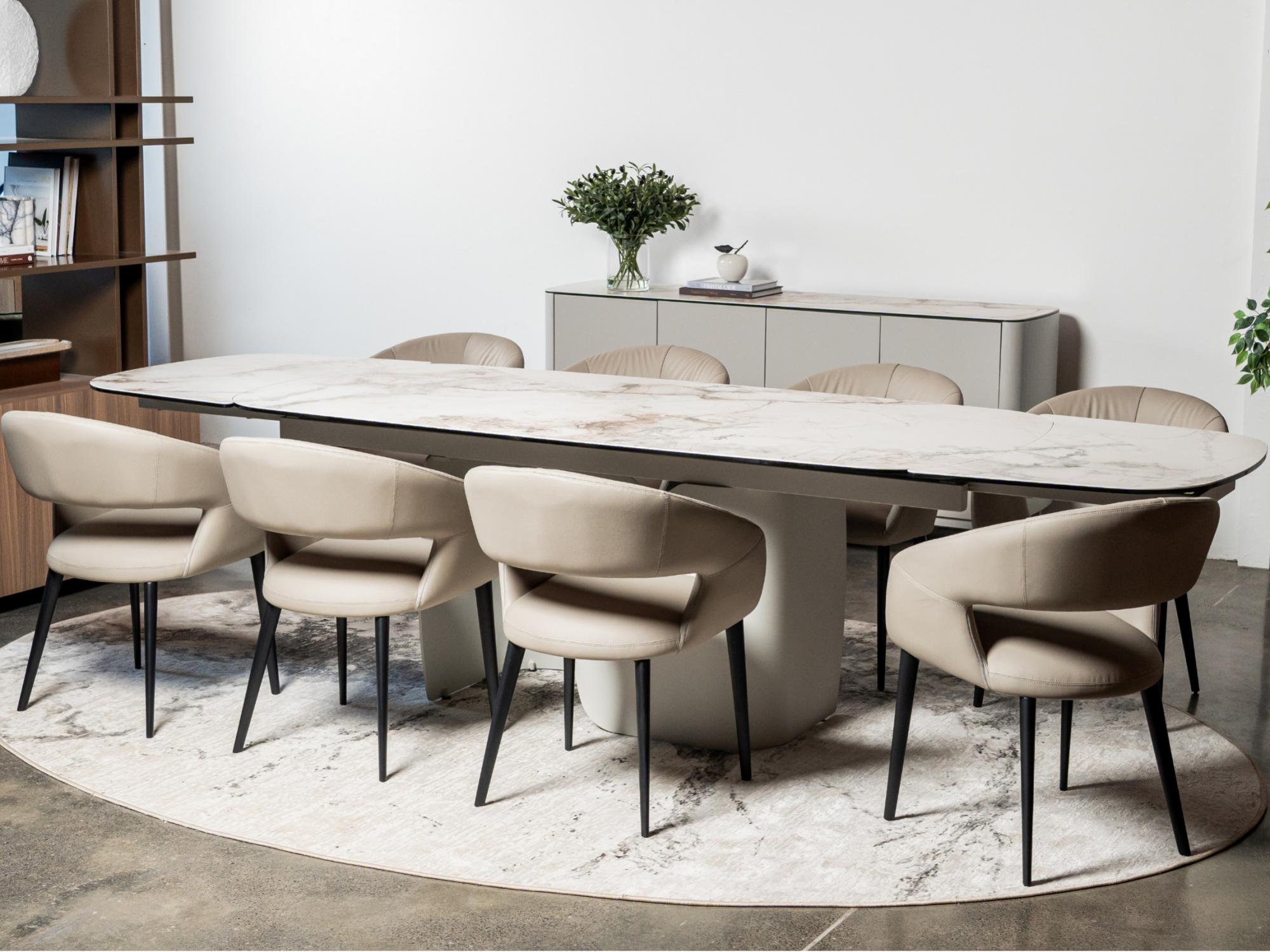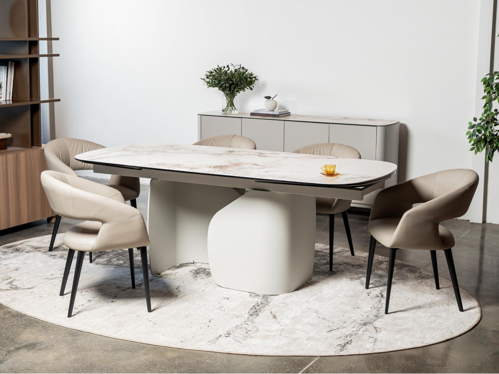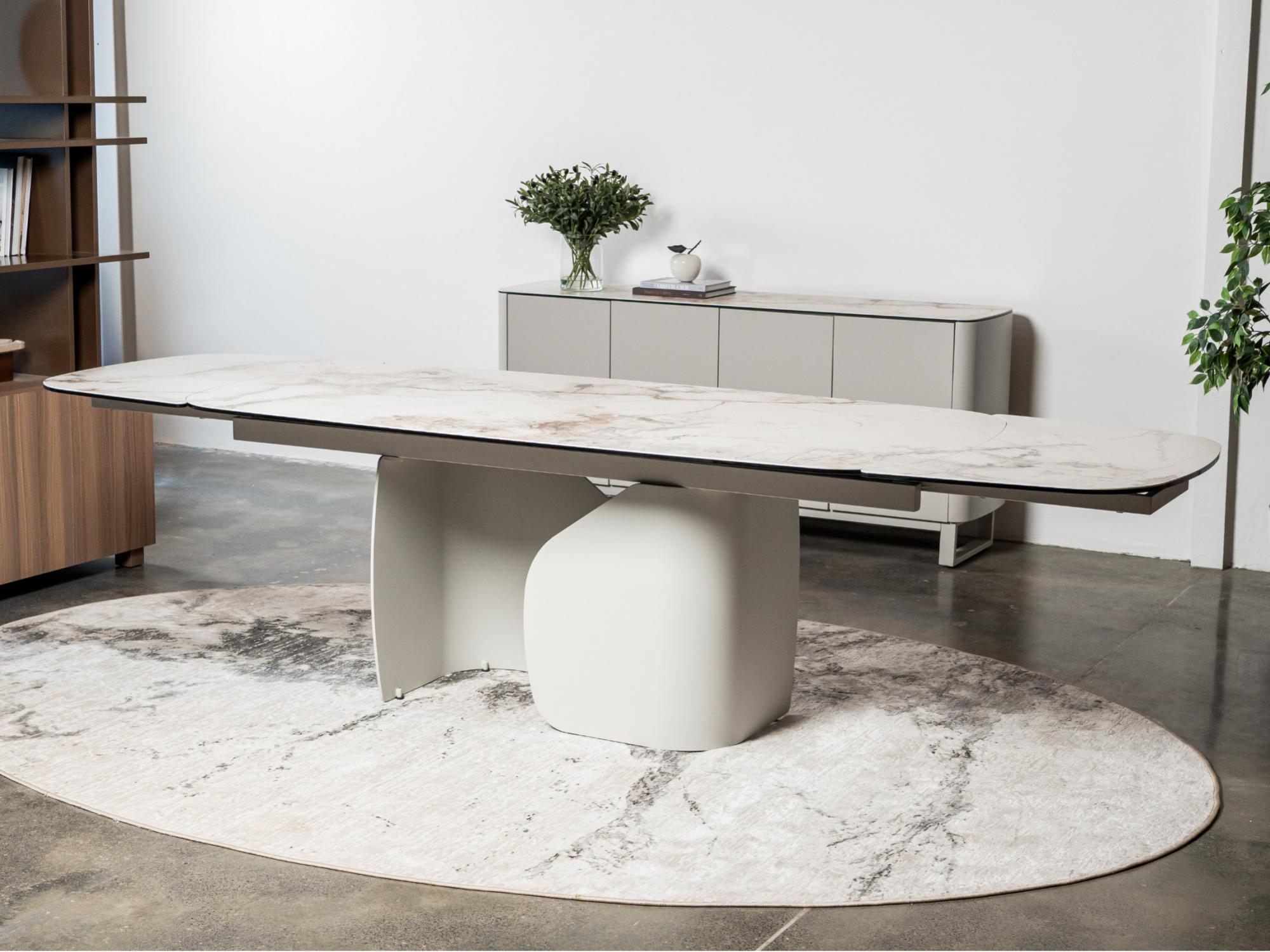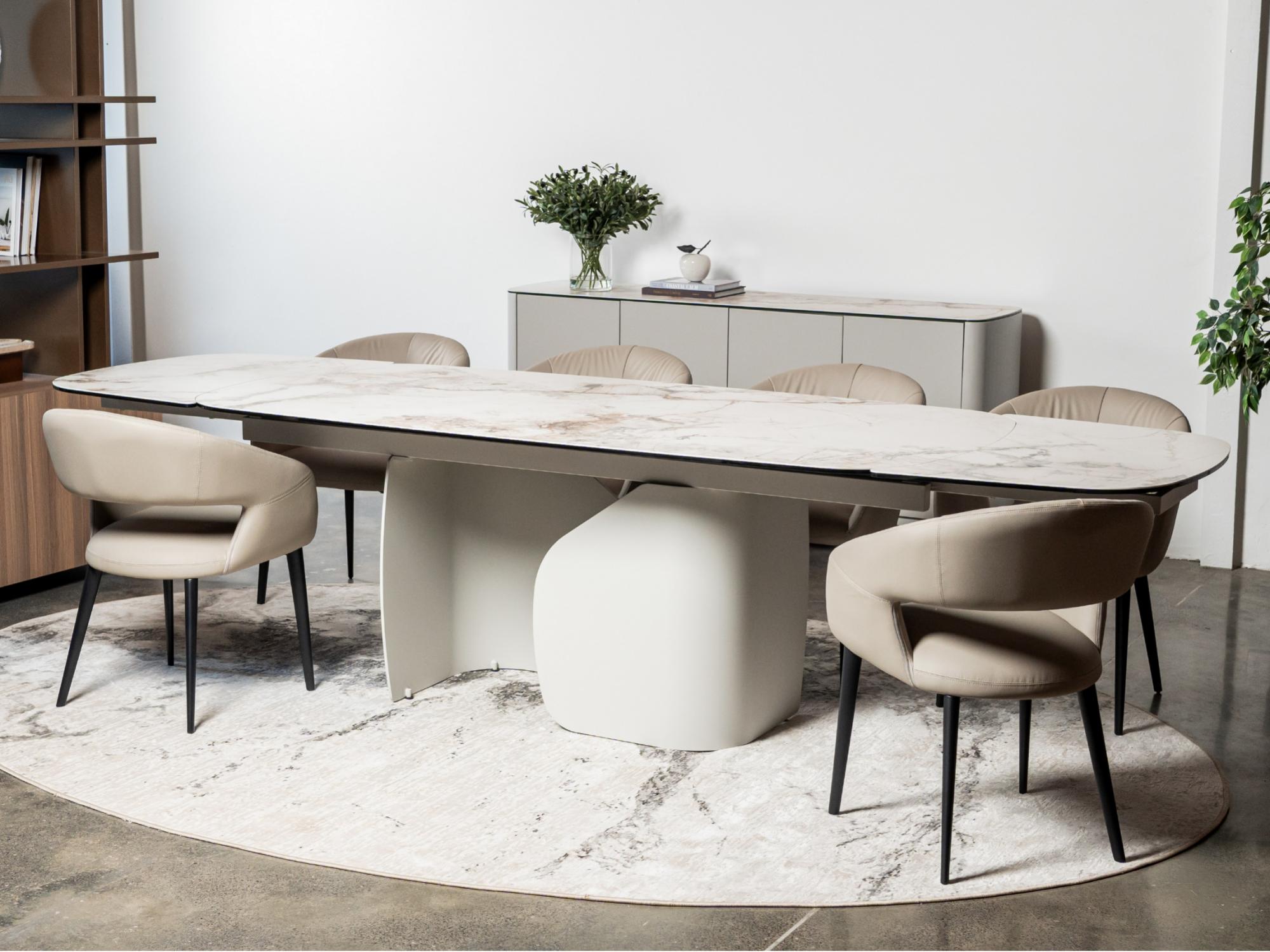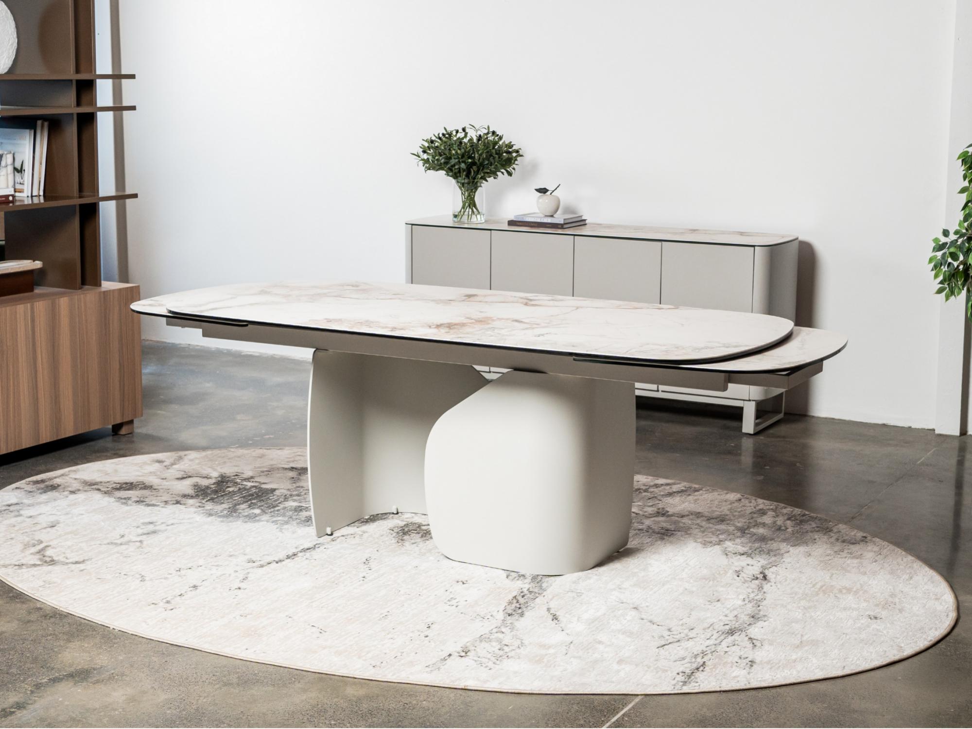 The Messina Extension Dining Table makes a bold contemporary statement with its sculptural silhouette and refined materials. Its matte Milan white marble ceramic top, layered on tempered glass, is scratch resistant and effortlessly elegant. Supported by an ivory powder-coated metal frame, the table extends seamlessly from 200 cm to 300 cm with side extensions, offering both functionality and sophistication for modern dining spaces.