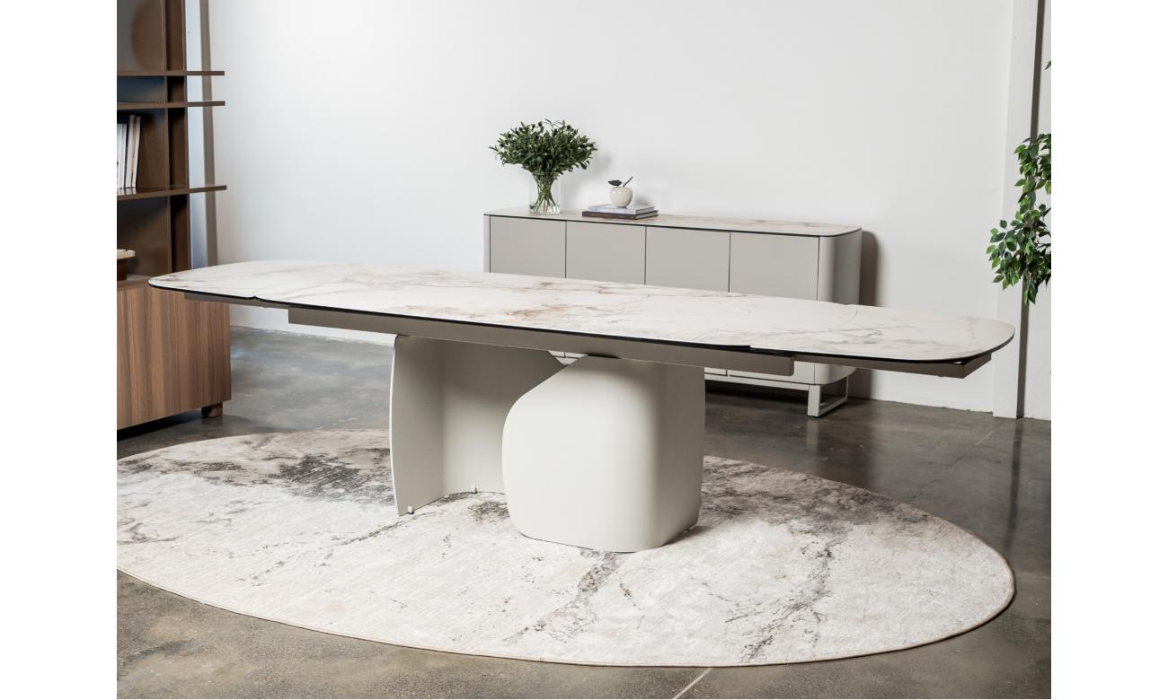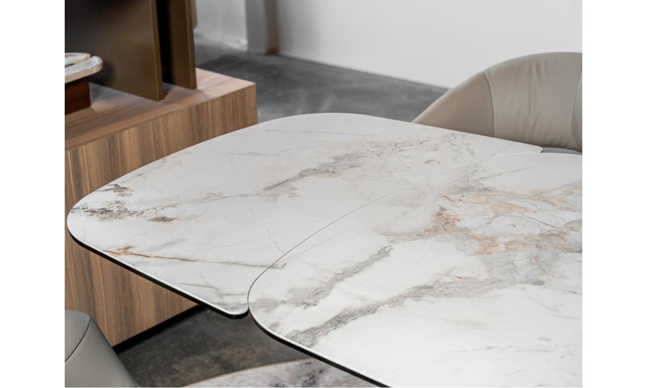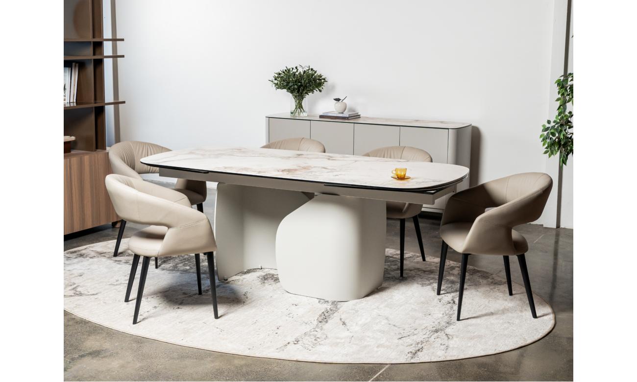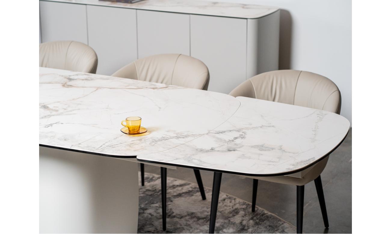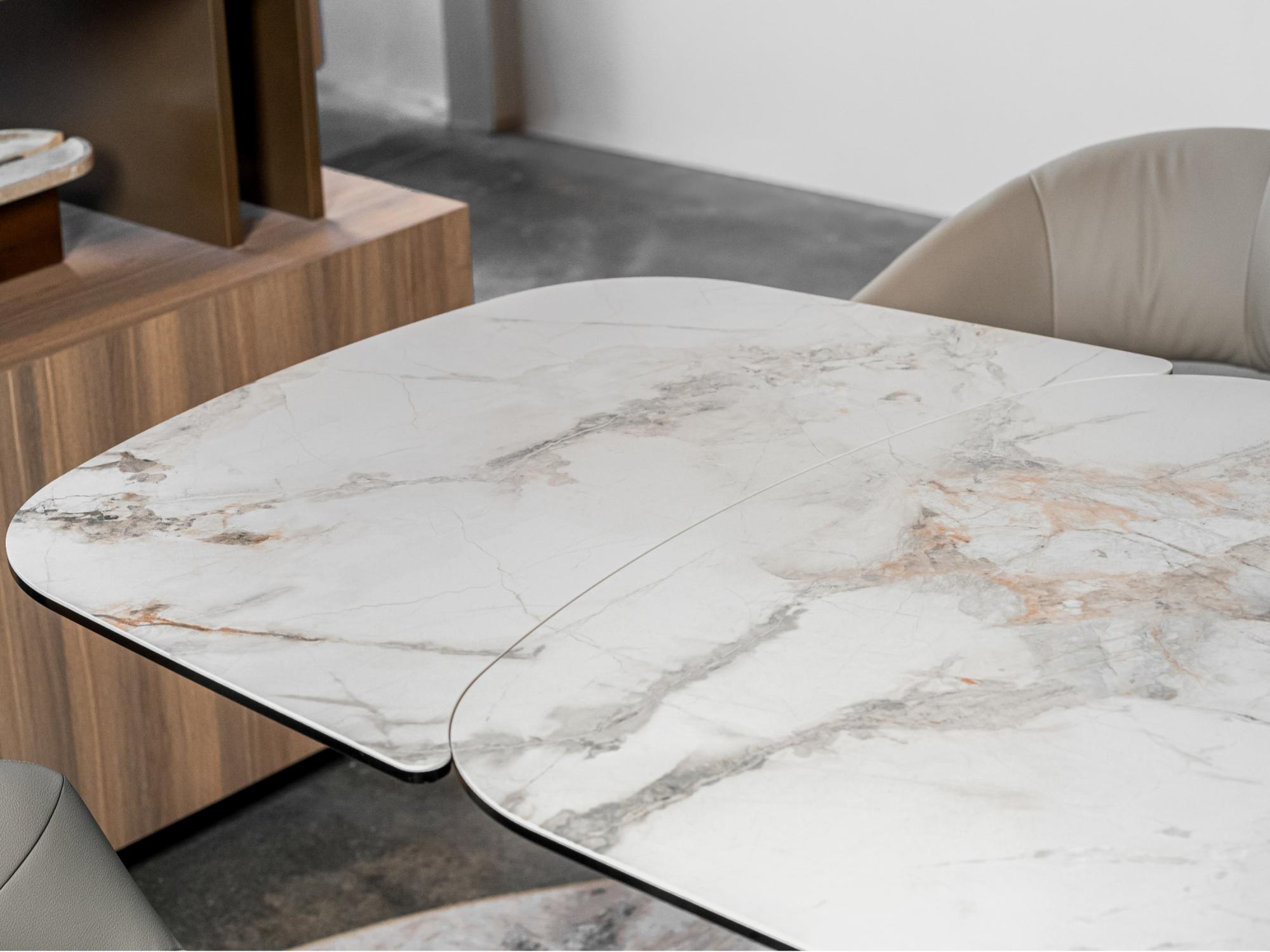 The Messina Extension Dining Table makes a bold contemporary statement with its sculptural silhouette and refined materials. Its matte Milan white marble ceramic top, layered on tempered glass, is scratch resistant and effortlessly elegant. Supported by an ivory powder-coated metal frame, the table extends seamlessly from 200 cm to 300 cm with side extensions, offering both functionality and sophistication for modern dining spaces.