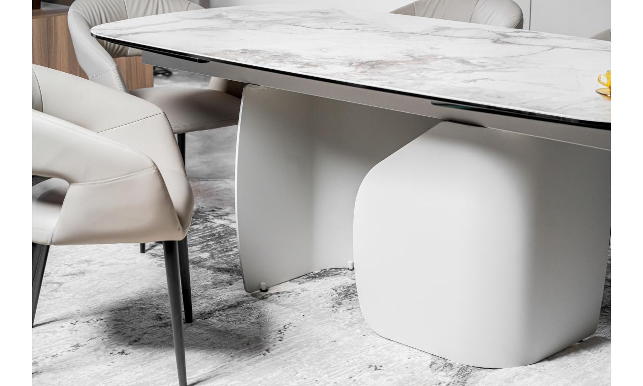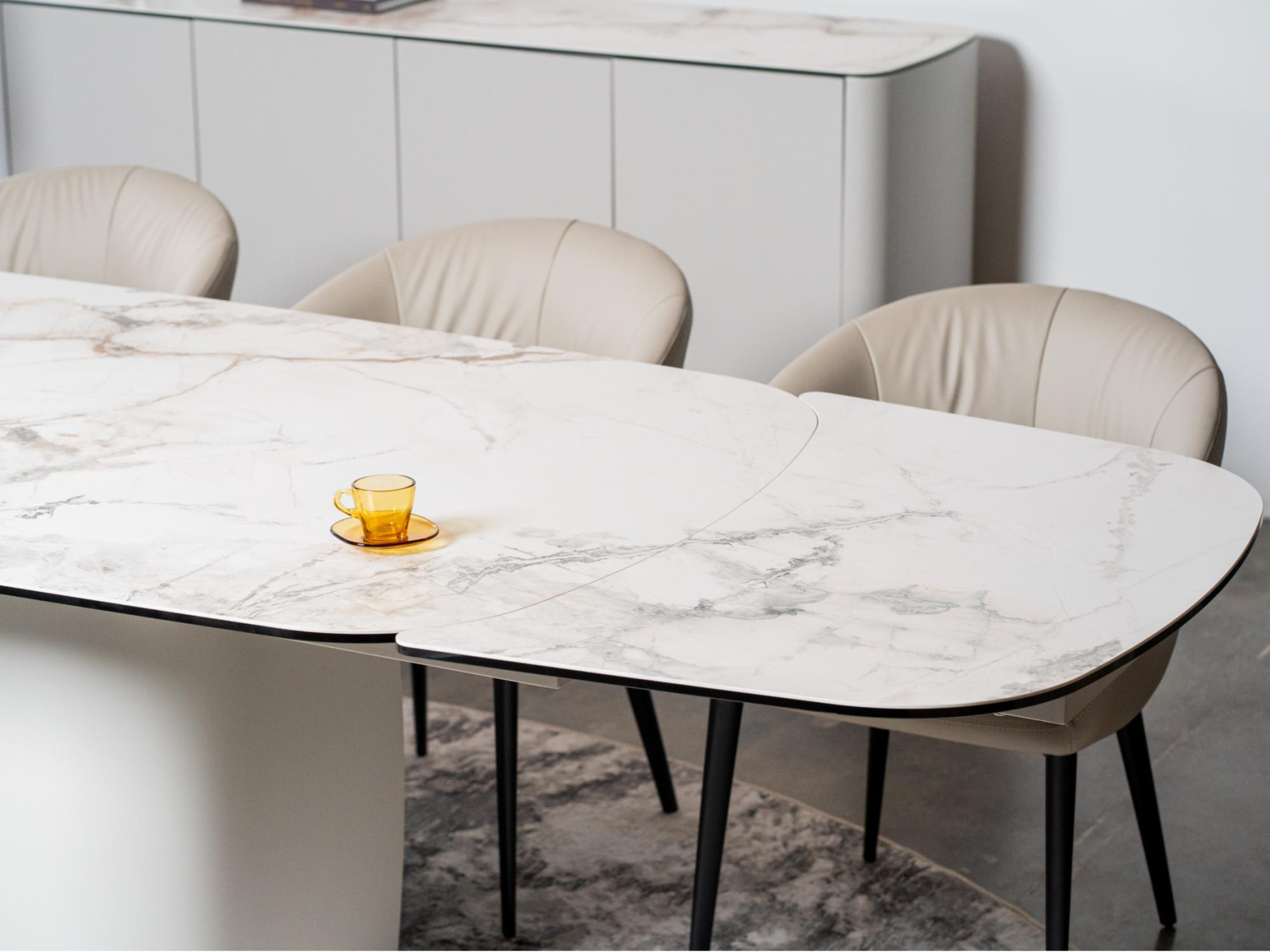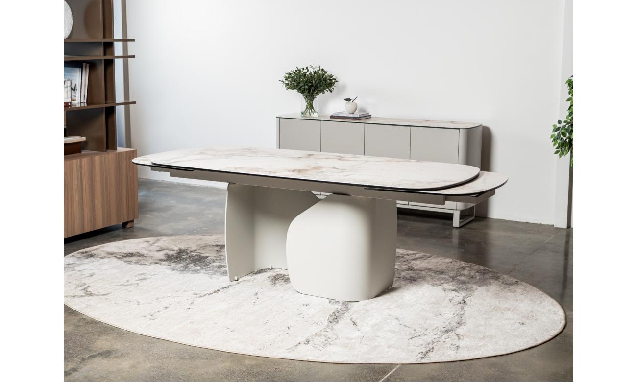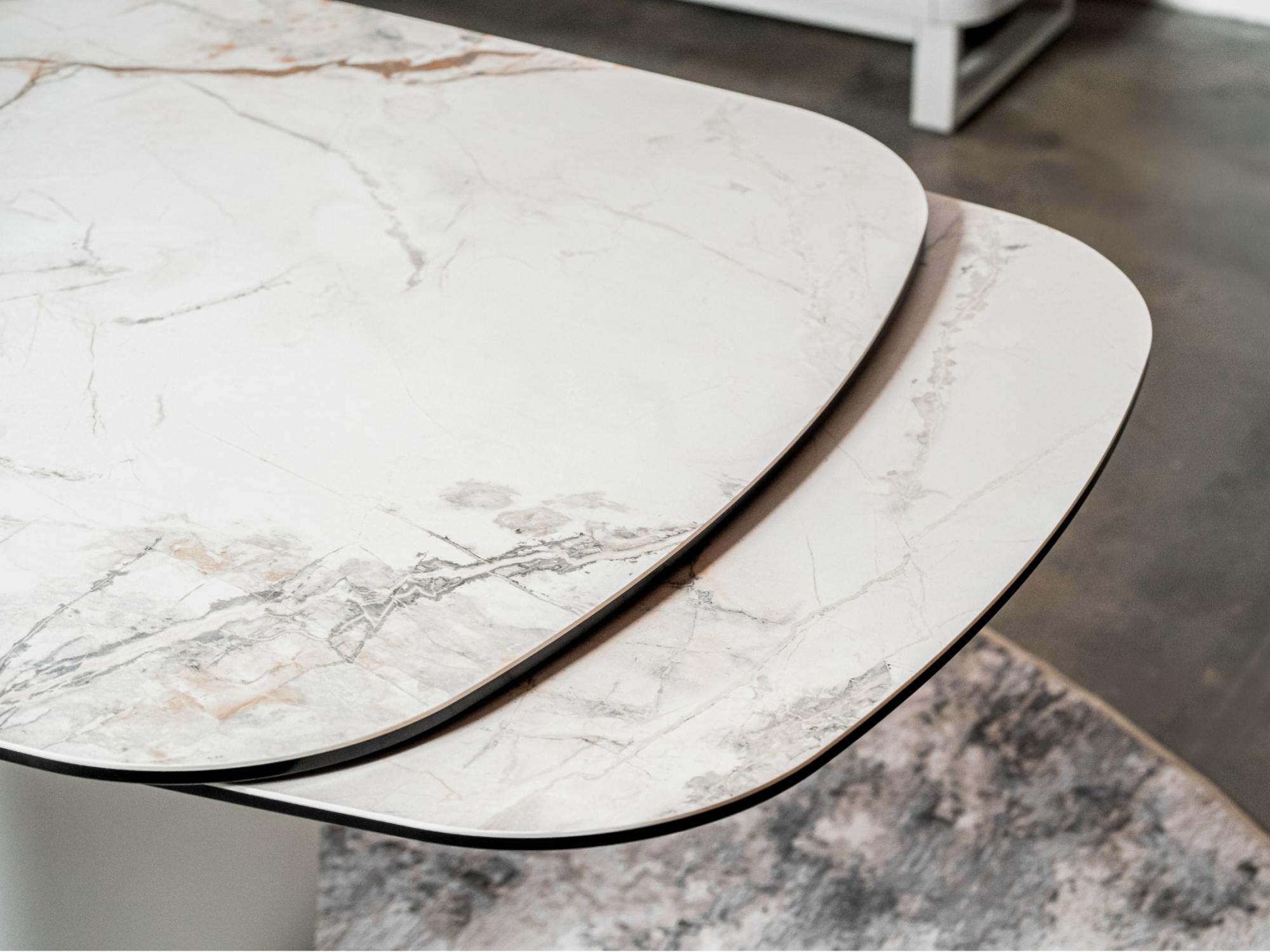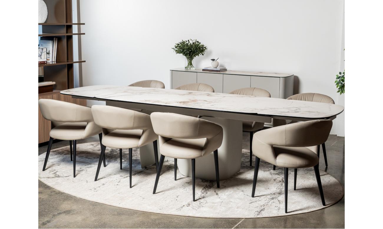 The Messina Extension Dining Table makes a bold contemporary statement with its sculptural silhouette and refined materials. Its matte Milan white marble ceramic top, layered on tempered glass, is scratch resistant and effortlessly elegant. Supported by an ivory powder-coated metal frame, the table extends seamlessly from 200 cm to 300 cm with side extensions, offering both functionality and sophistication for modern dining spaces.