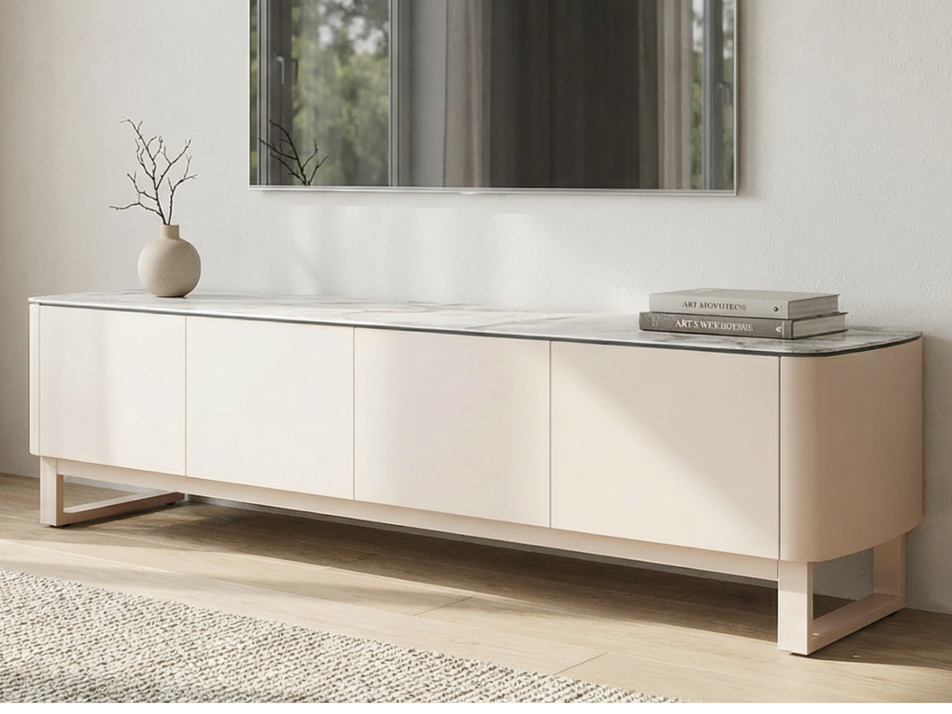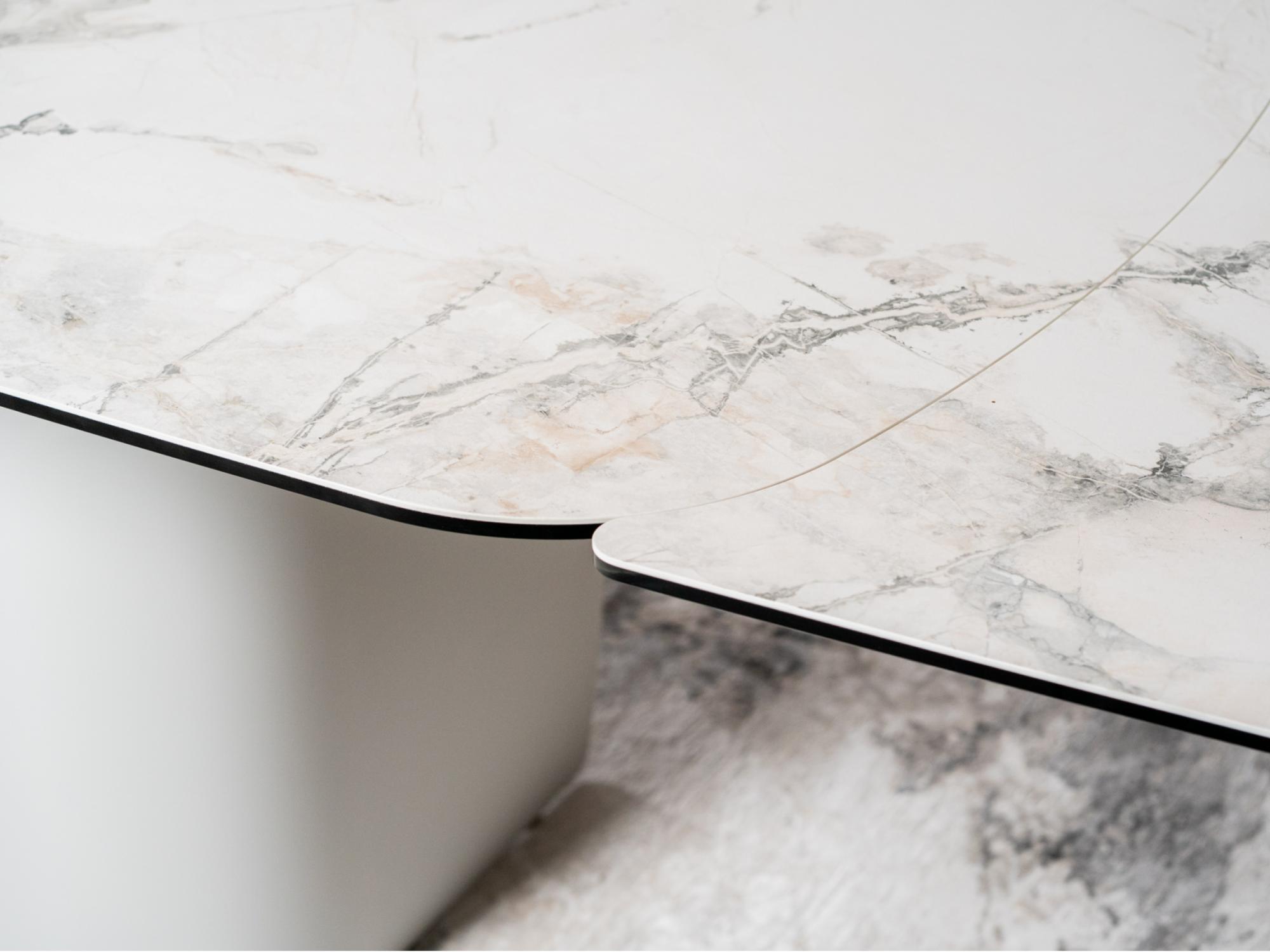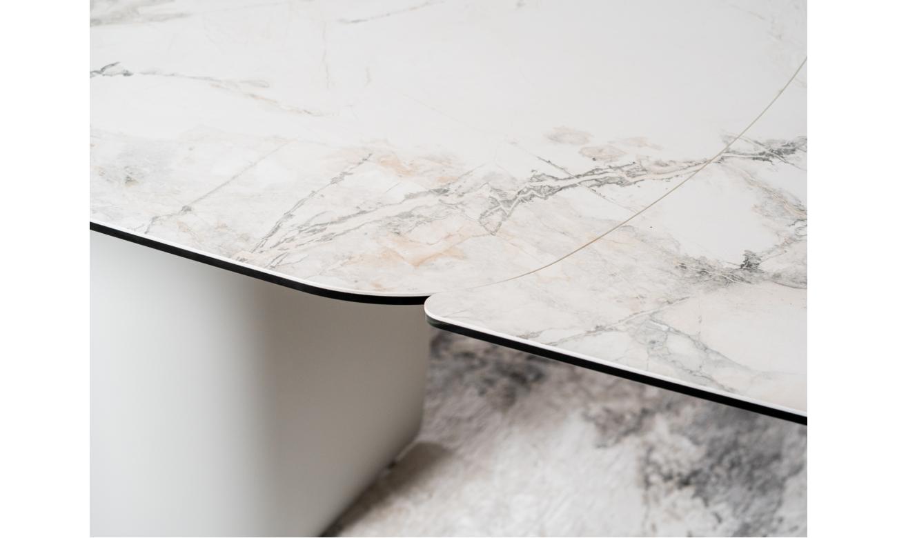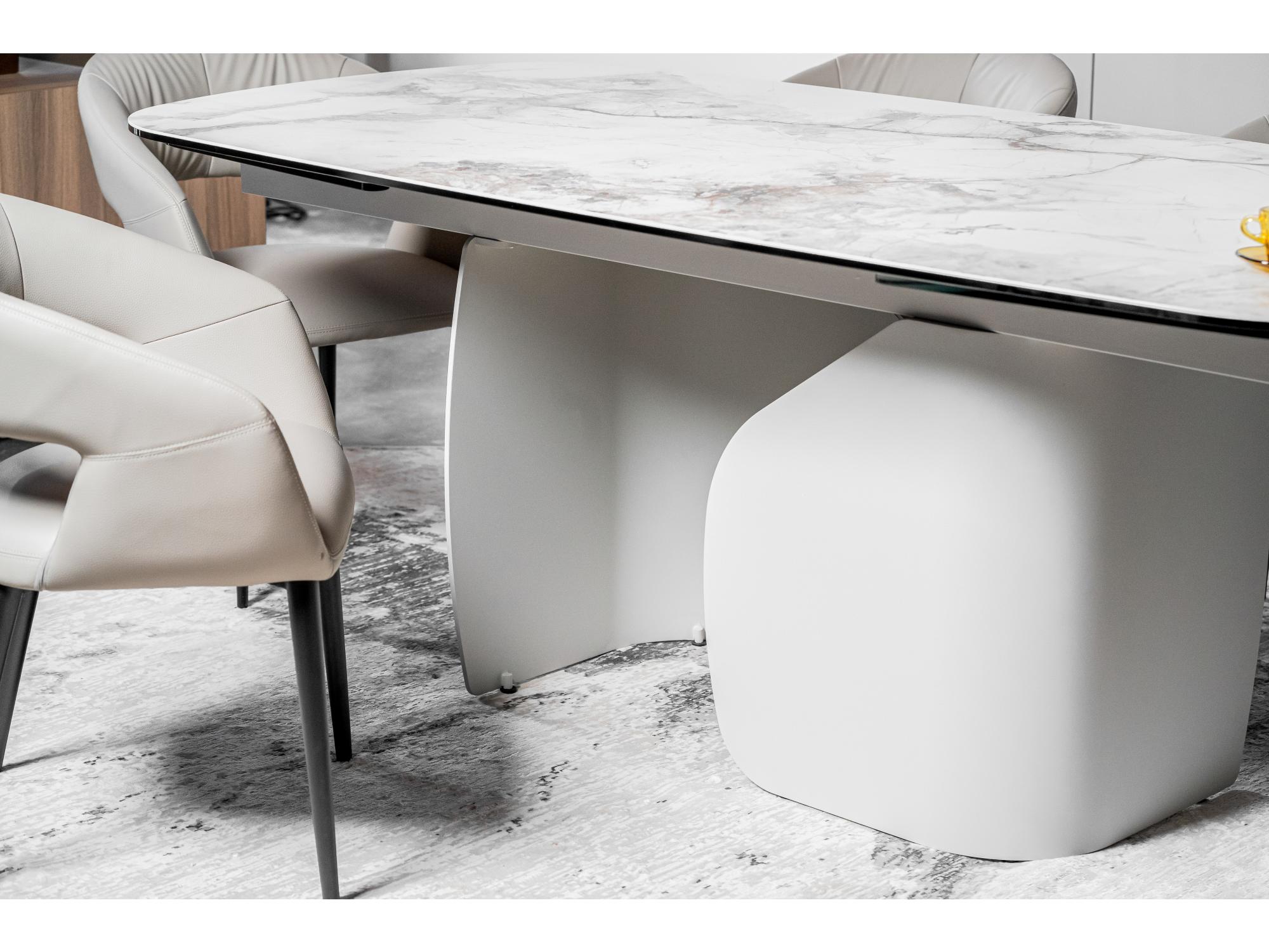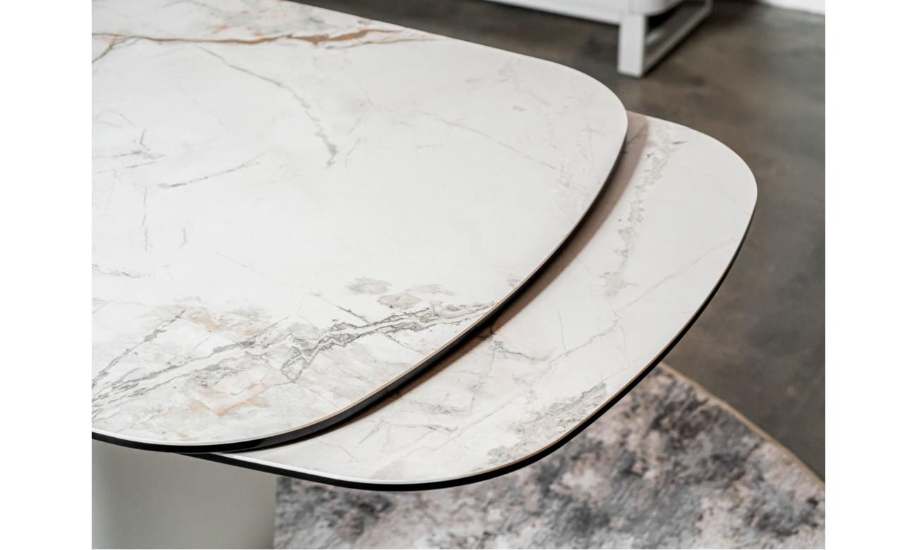 The Messina Extension Dining Table makes a bold contemporary statement with its sculptural silhouette and refined materials. Its matte Milan white marble ceramic top, layered on tempered glass, is scratch resistant and effortlessly elegant. Supported by an ivory powder-coated metal frame, the table extends seamlessly from 200 cm to 300 cm with side extensions, offering both functionality and sophistication for modern dining spaces.