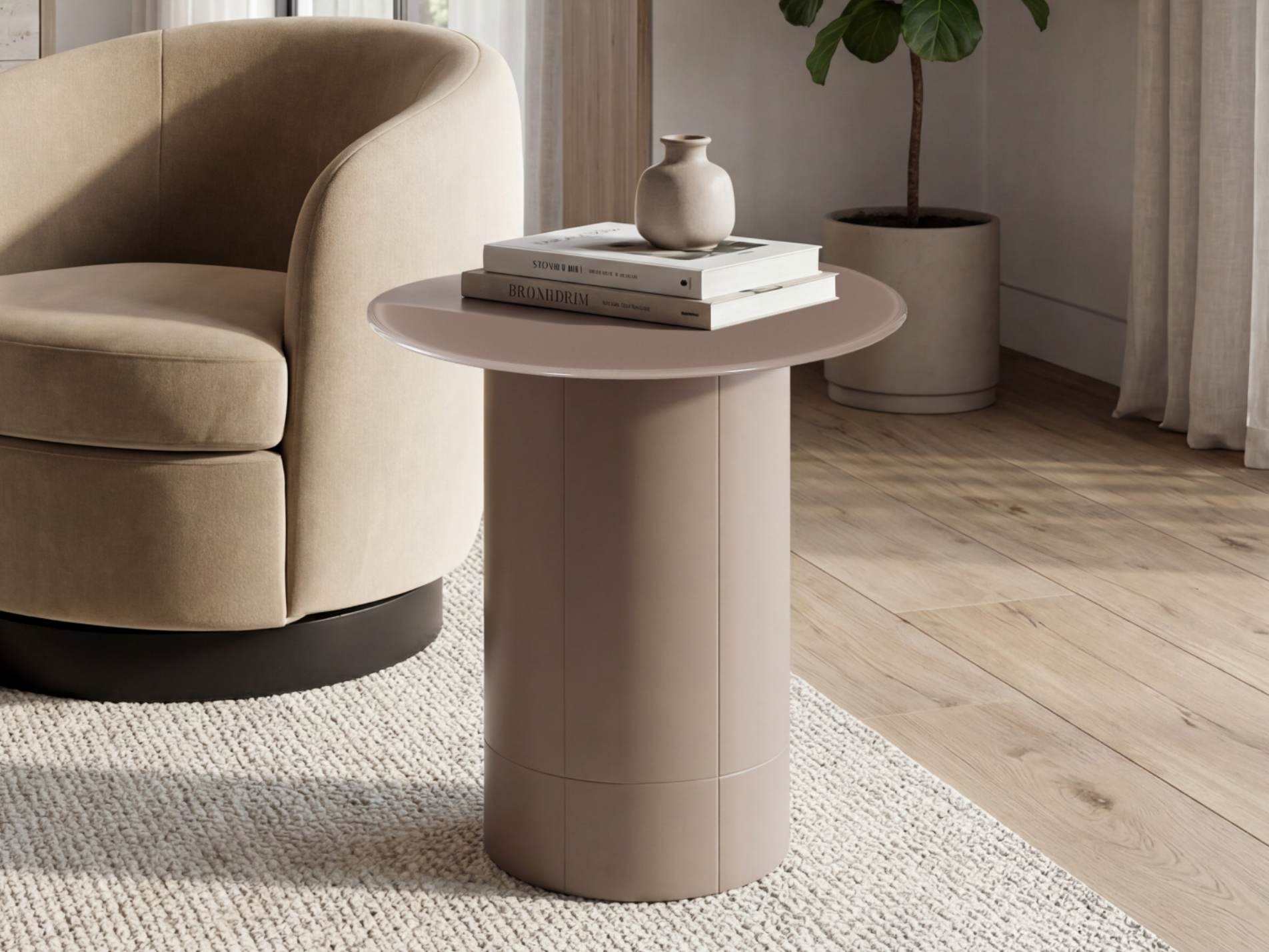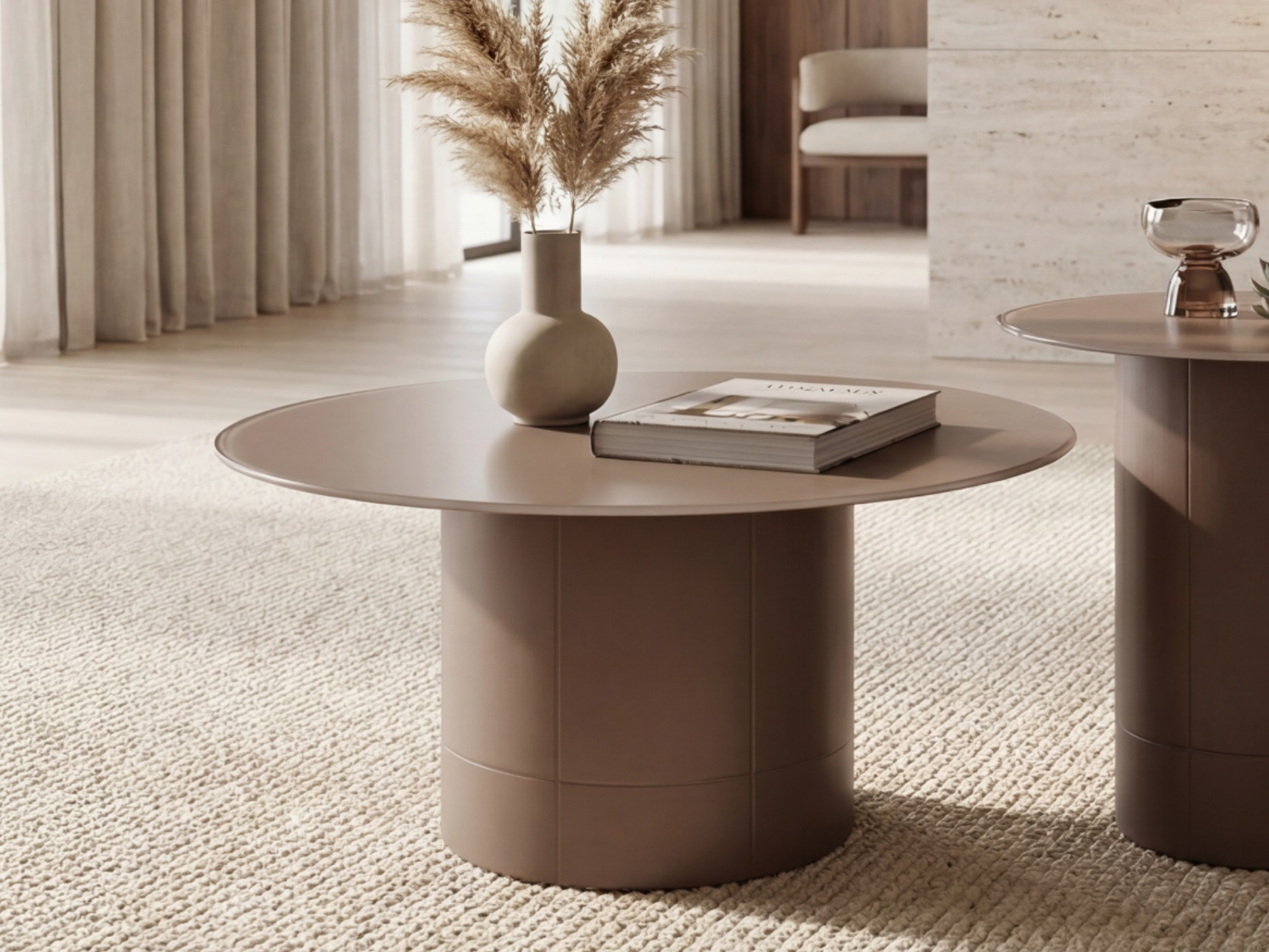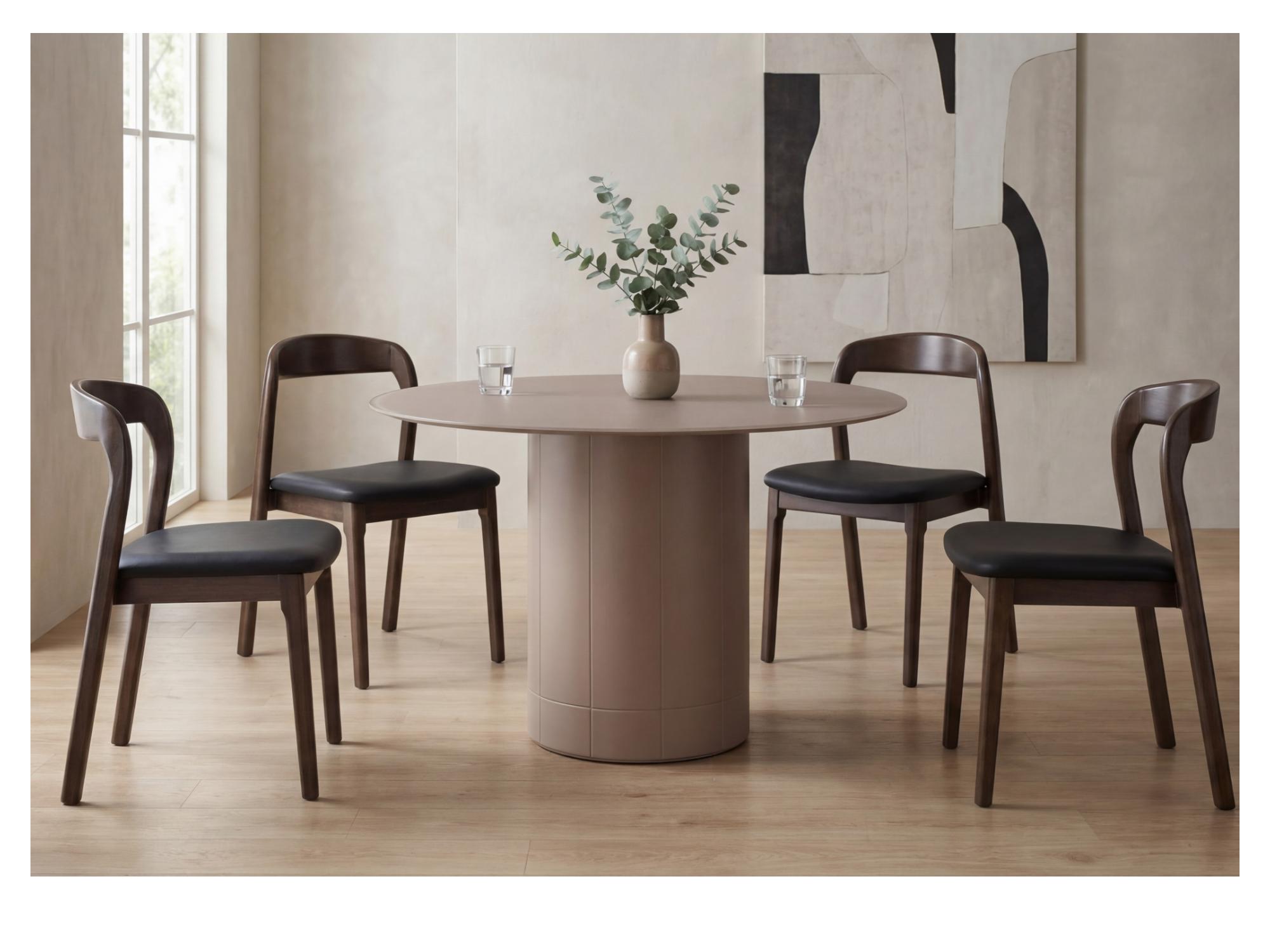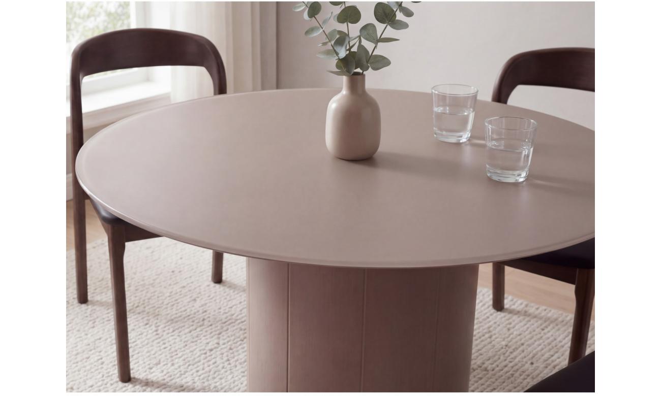Rimini celebrates connection through its round silhouette. The pedestal base allows flexible seating while maintaining a clean, uninterrupted form.