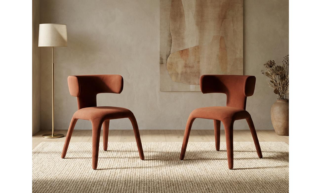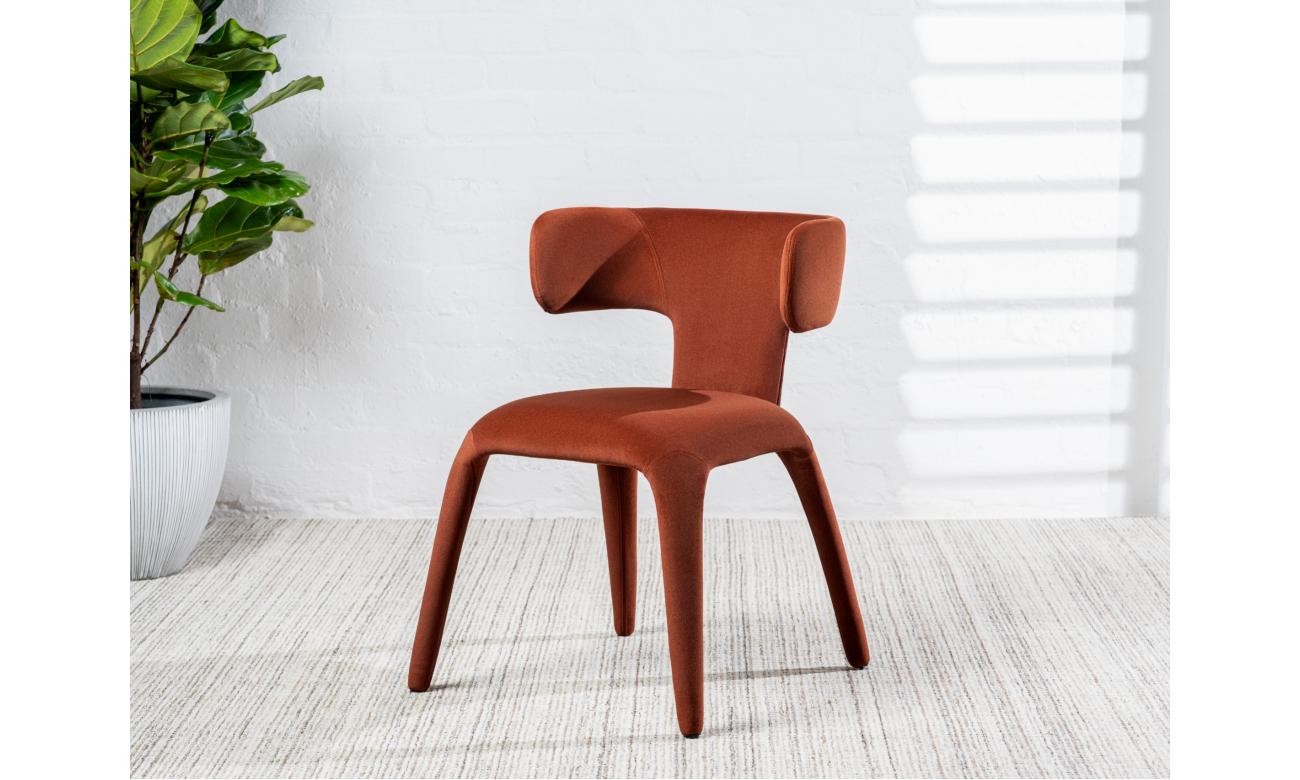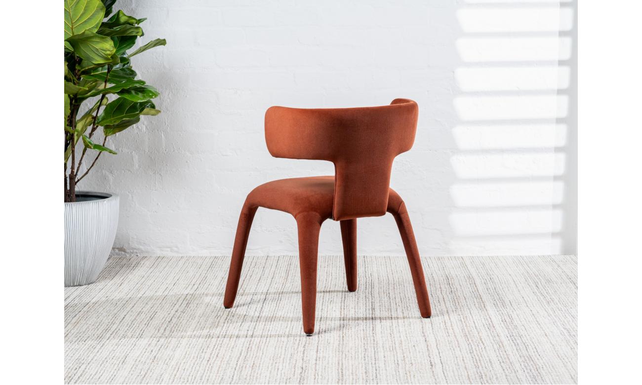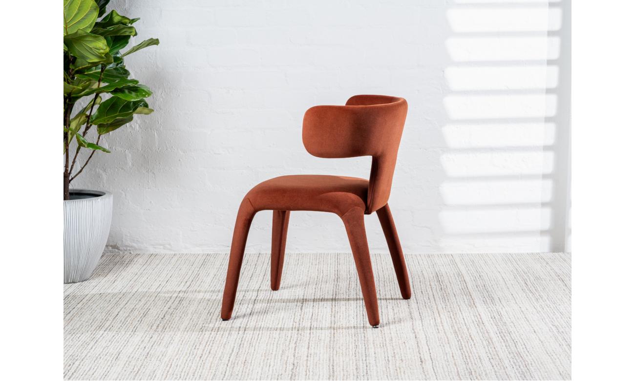 With mid-century style and warm rust fabric, the Taurus dining chairs bring personality to the table. Ideal for casual meals and formal dinners alike.