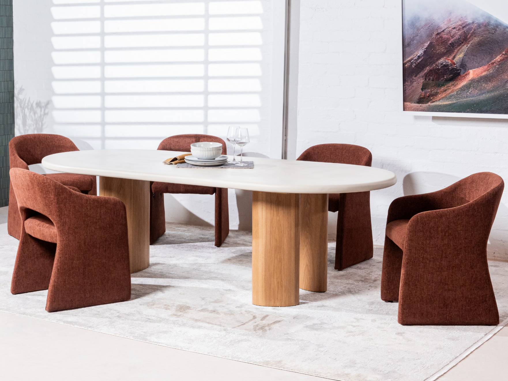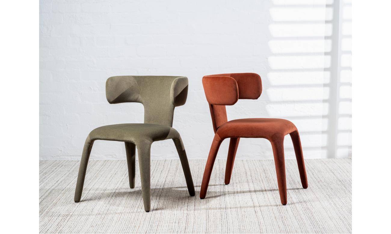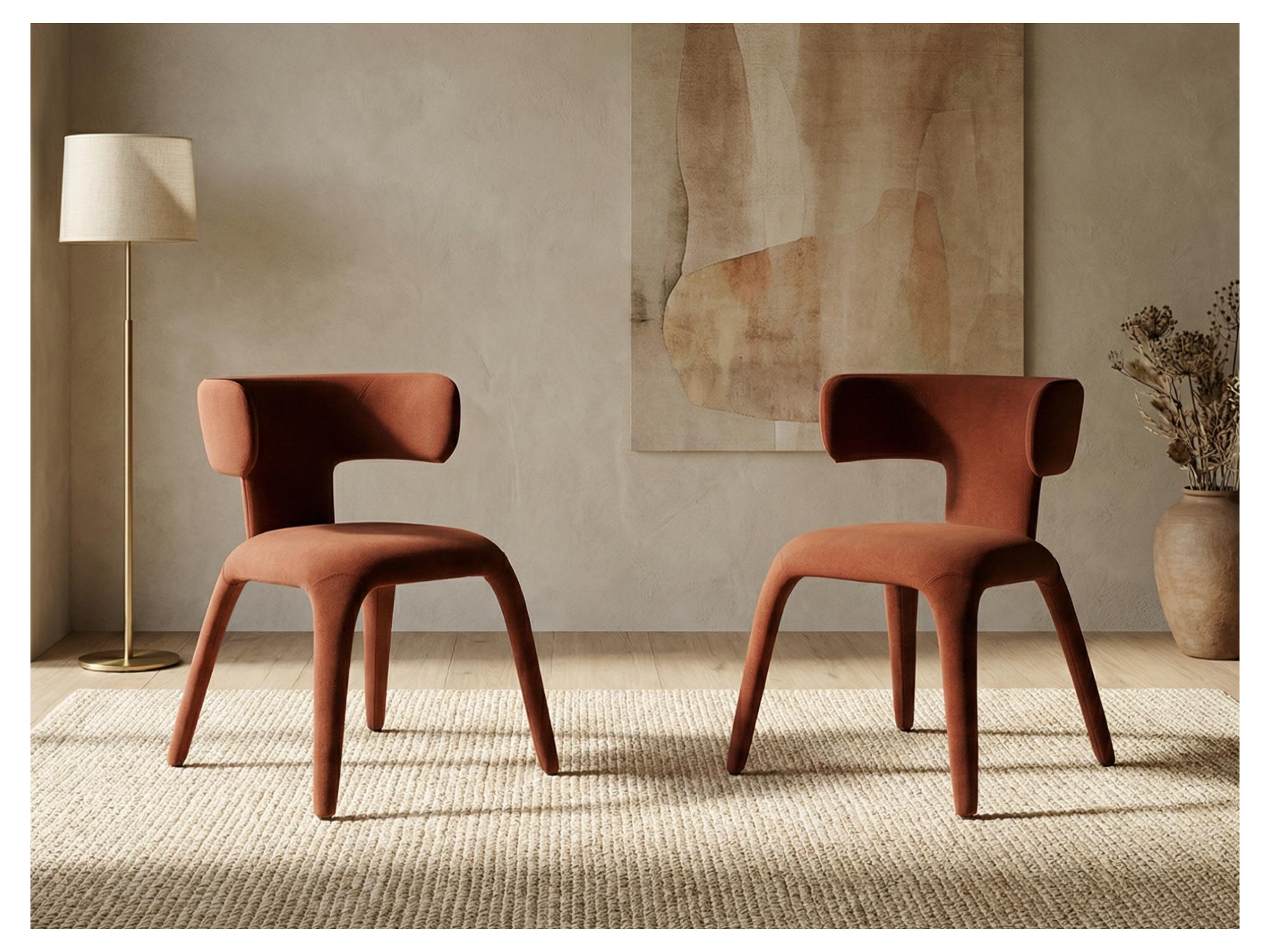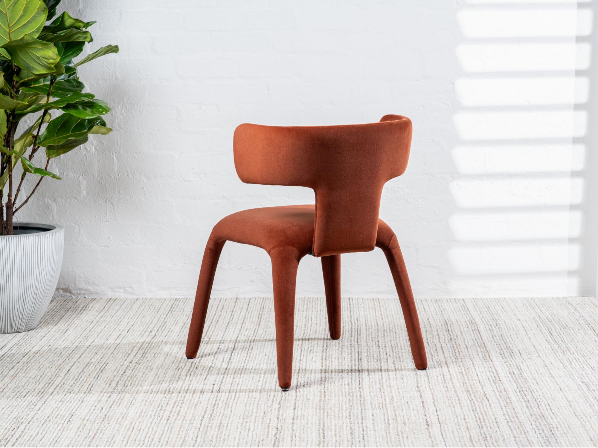 With mid-century style and warm rust fabric, the Taurus dining chairs bring personality to the table. Ideal for casual meals and formal dinners alike.
