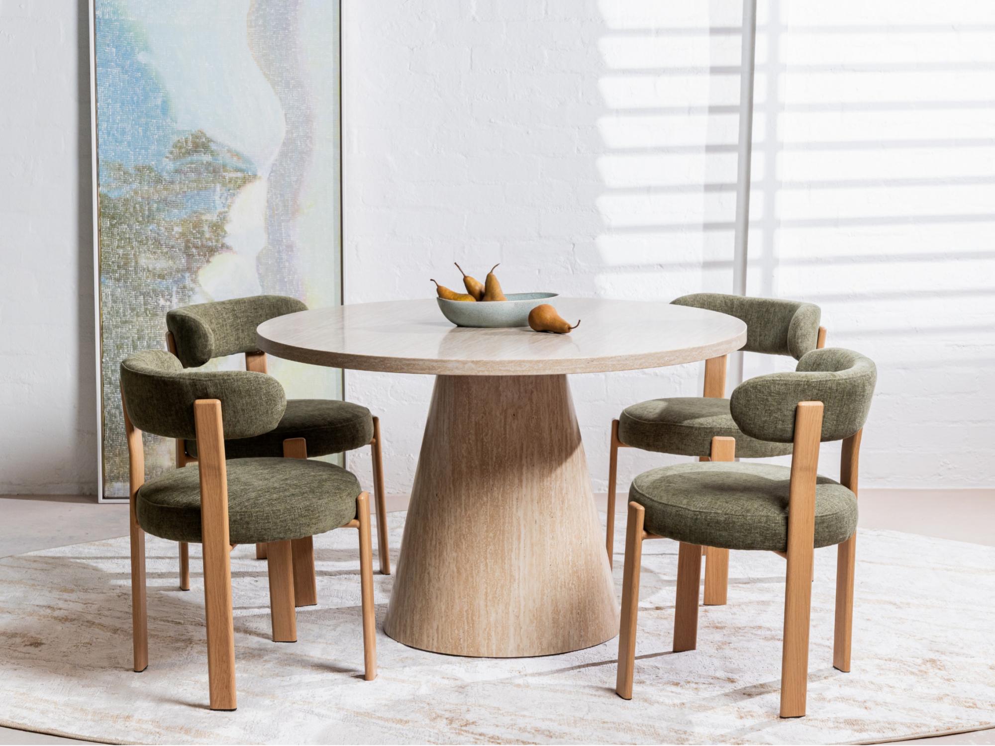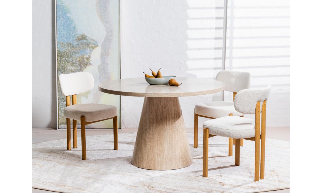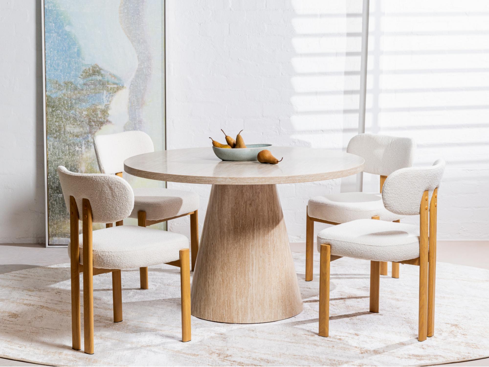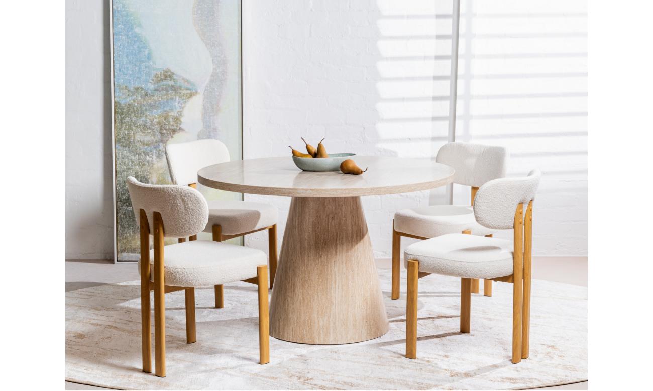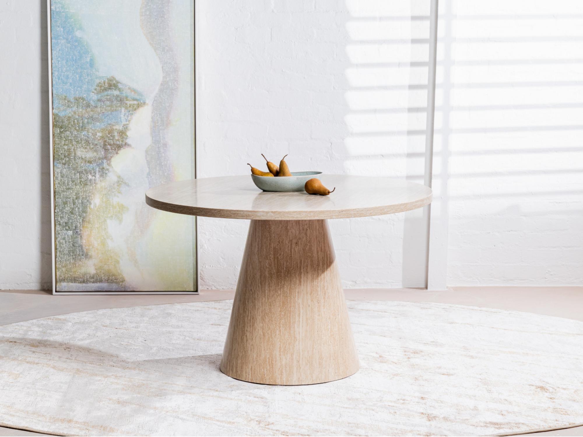 The Tessa Dining Table brings classy modern style to your home. Perfect for a dining area or breakfast nook, this round table features a beautiful column in the center for added visual interest. With its unique travertine look, you'll love how this elegant piece adds to any decor style. The stone featured finish ensures gives the table an overall high-end look and feel. Enjoy hosting your family and friends at your home with the stylish Tessa Dining Table.