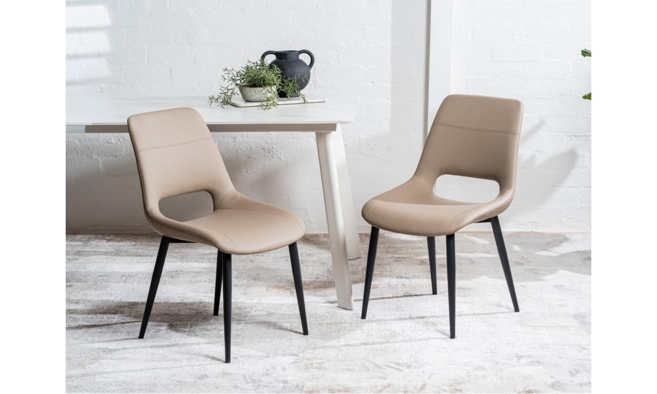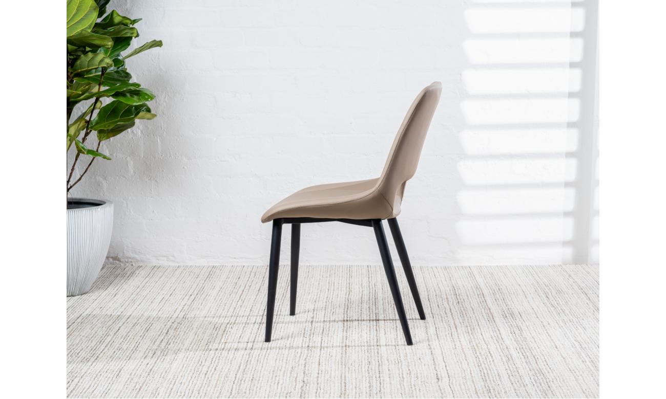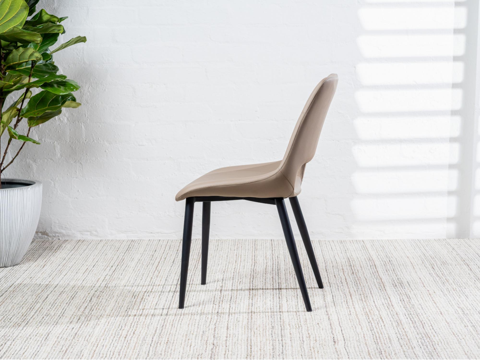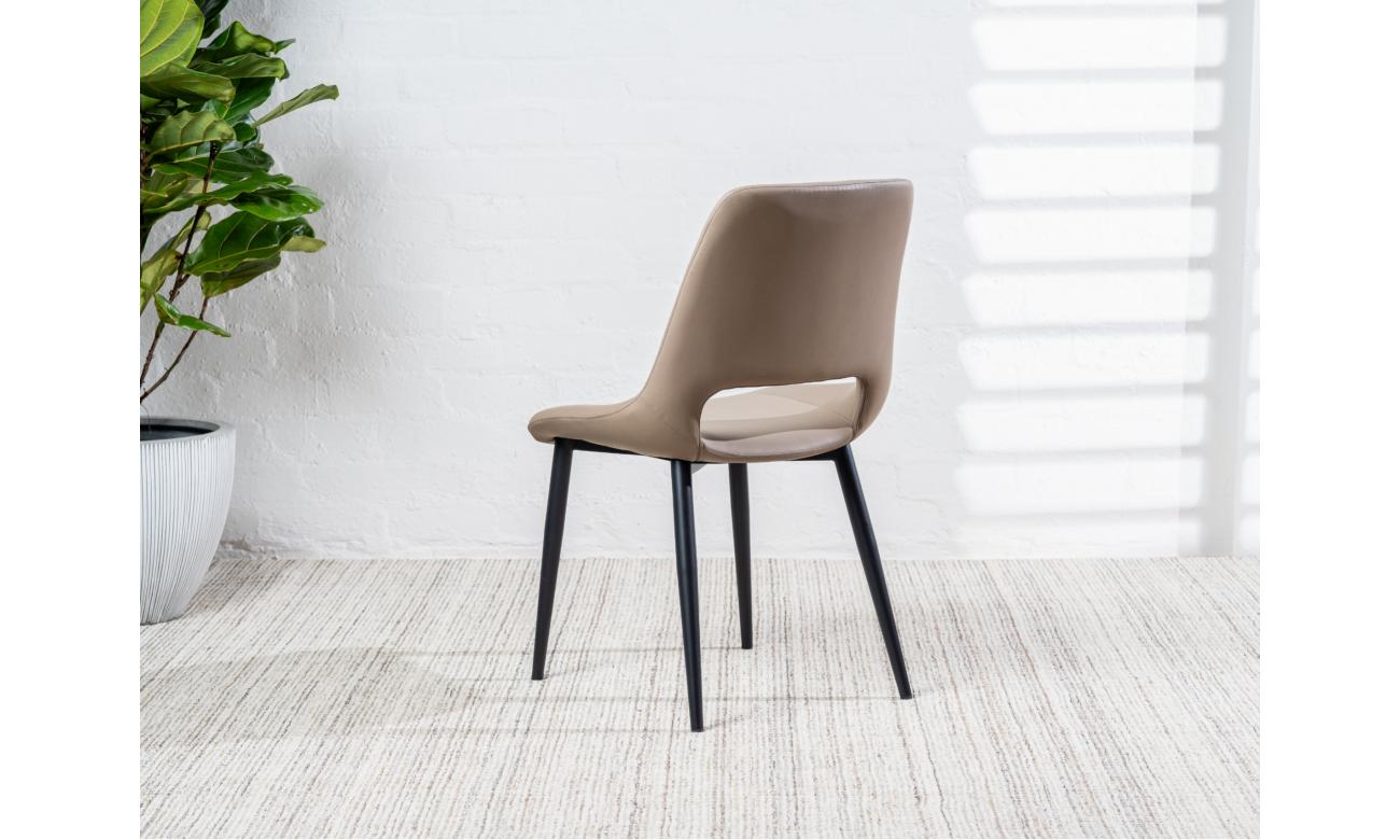 Exude refined elegance with the Vienna Dining Chair, where sumptuous taupe and rich black eco leather create a luxurious, layered look. The exquisite materials are complemented by a sleek black powder-coated metal frame, ensuring a piece that is both durable and sophisticated. Designed for those who appreciate timeless luxury and modern craftsmanship, the Vienna chair effortlessly elevates any dining space with its contemporary yet classic presence.