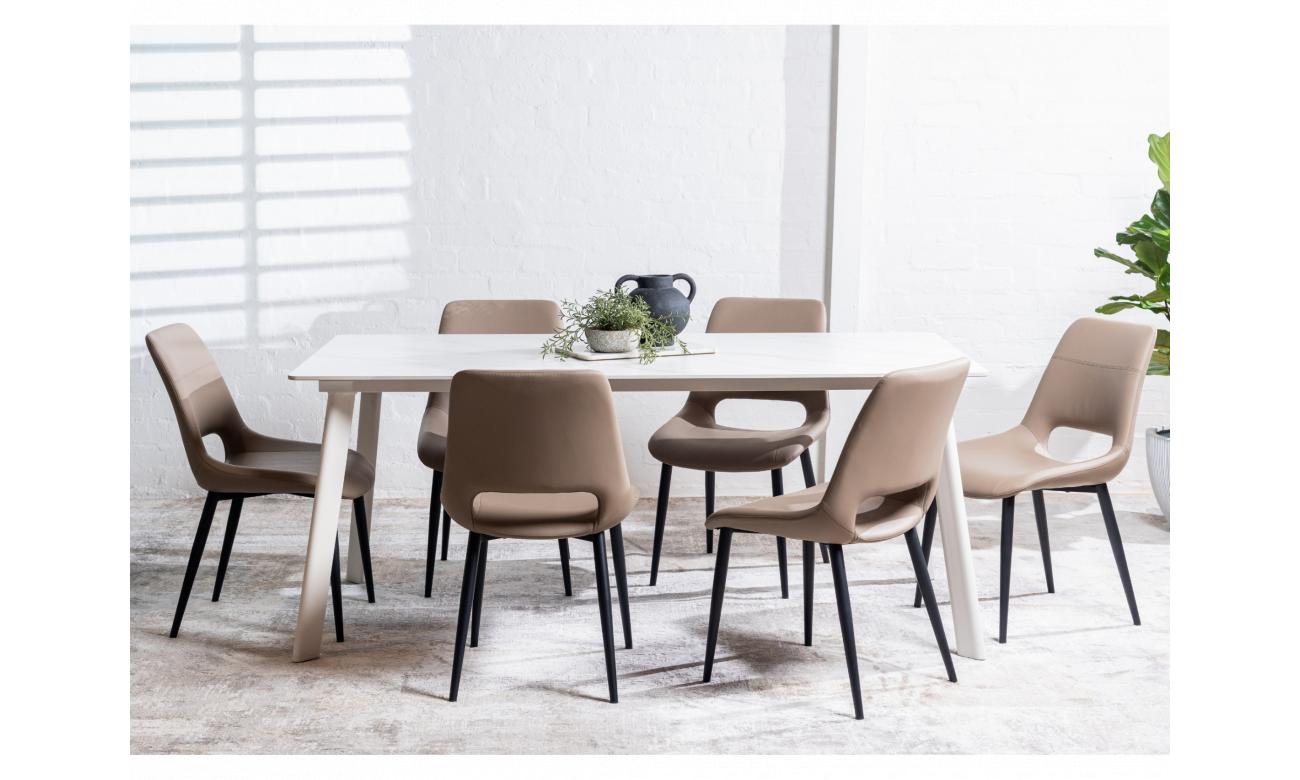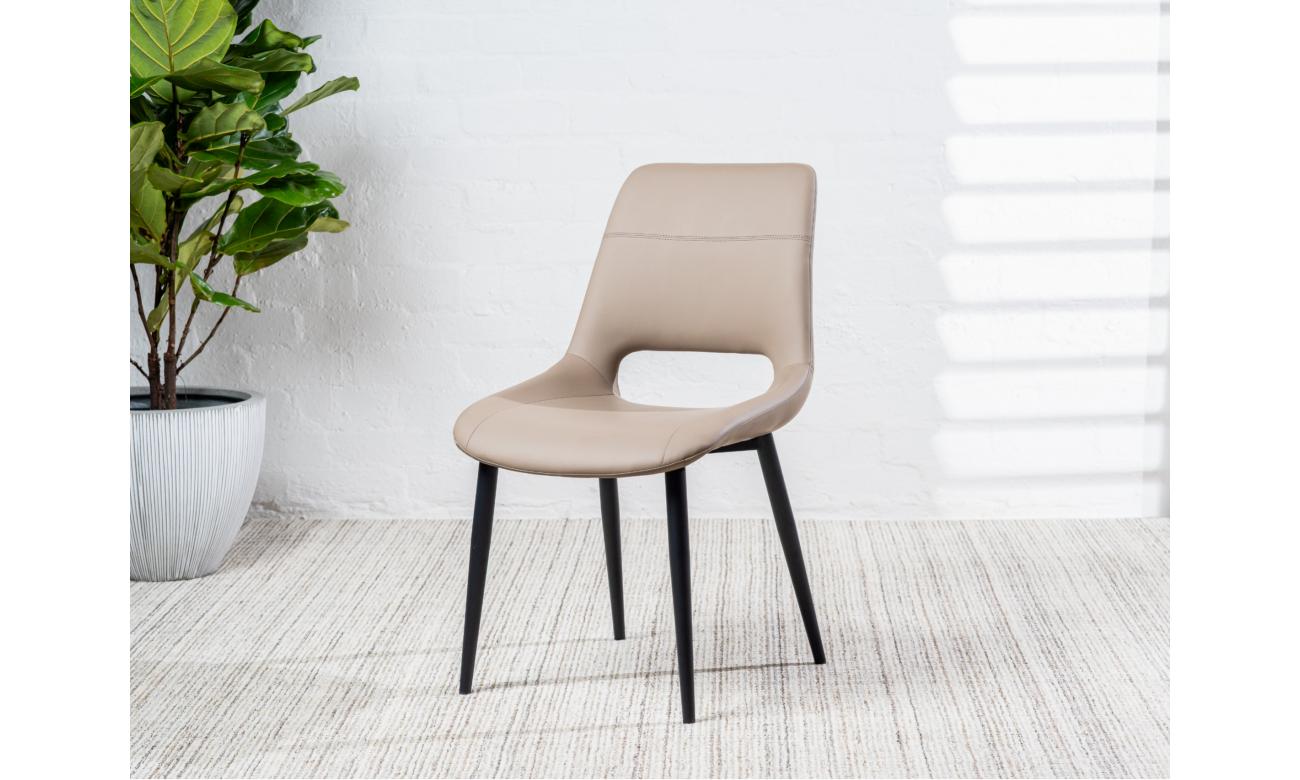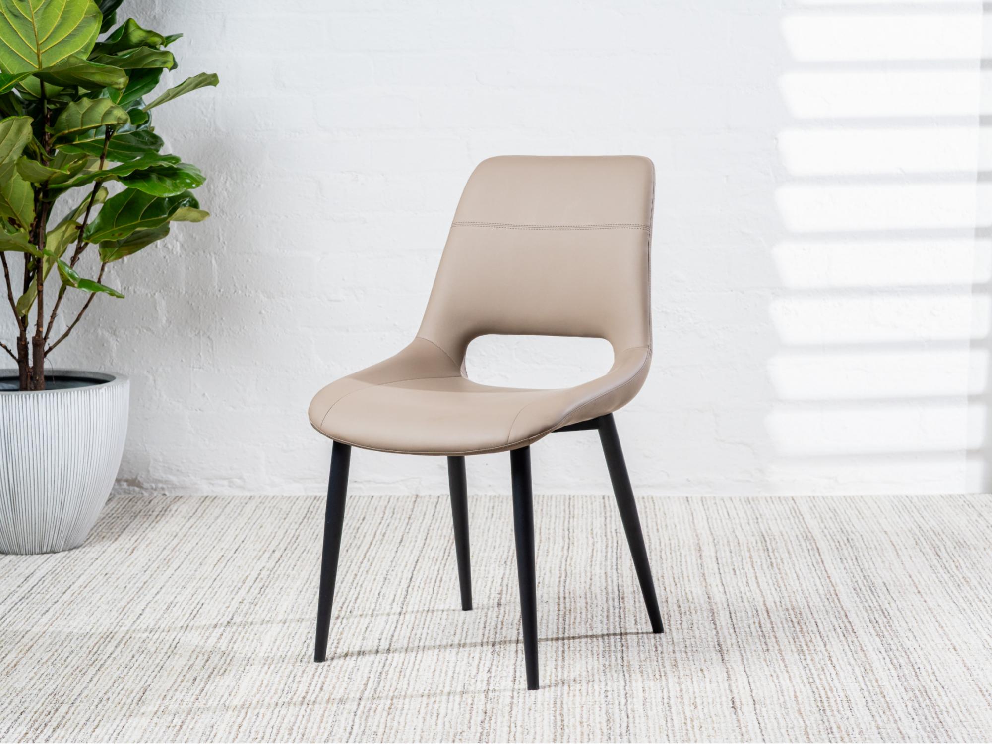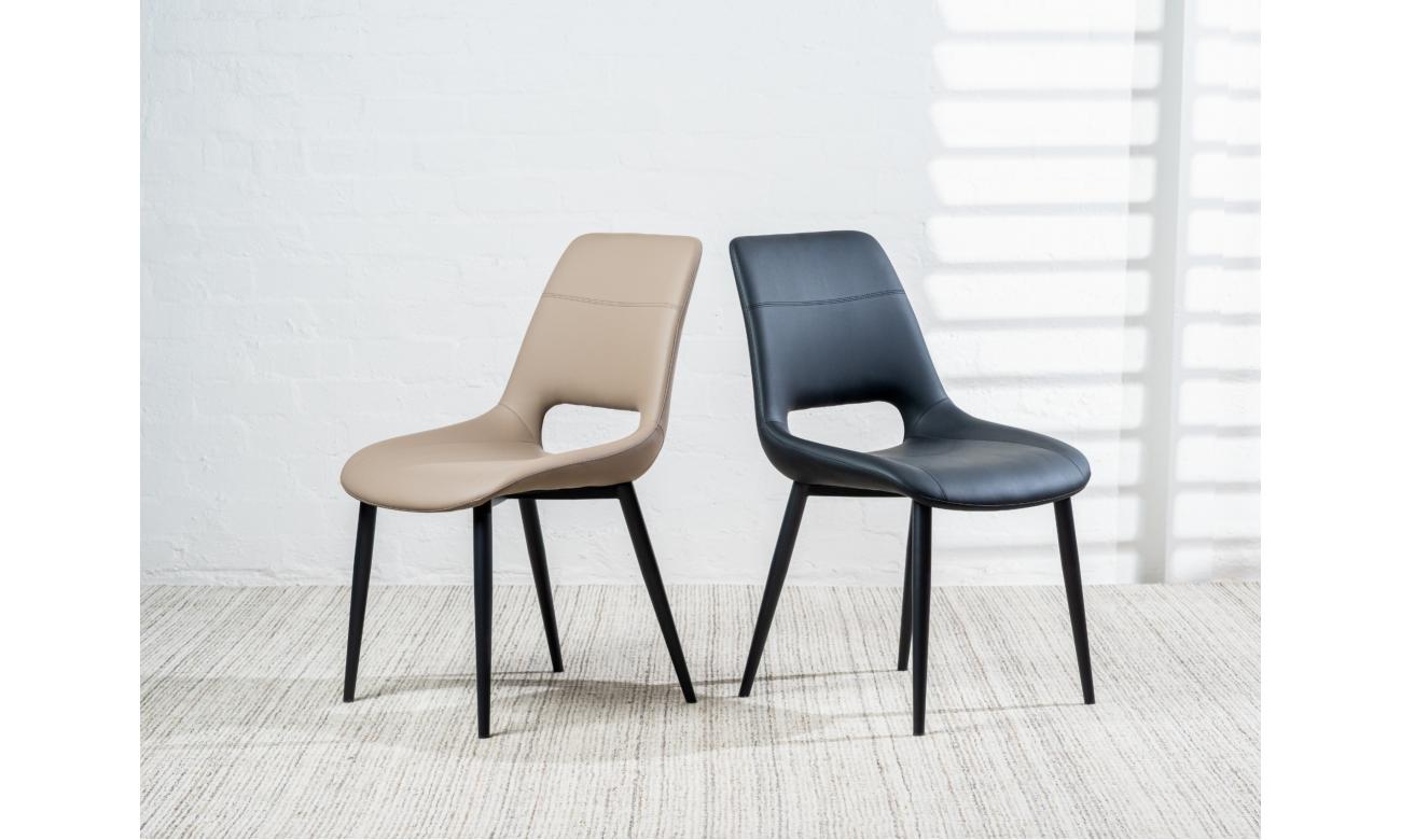 Exude refined elegance with the Vienna Dining Chair, where sumptuous taupe and rich black eco leather create a luxurious, layered look. The exquisite materials are complemented by a sleek black powder-coated metal frame, ensuring a piece that is both durable and sophisticated. Designed for those who appreciate timeless luxury and modern craftsmanship, the Vienna chair effortlessly elevates any dining space with its contemporary yet classic presence.